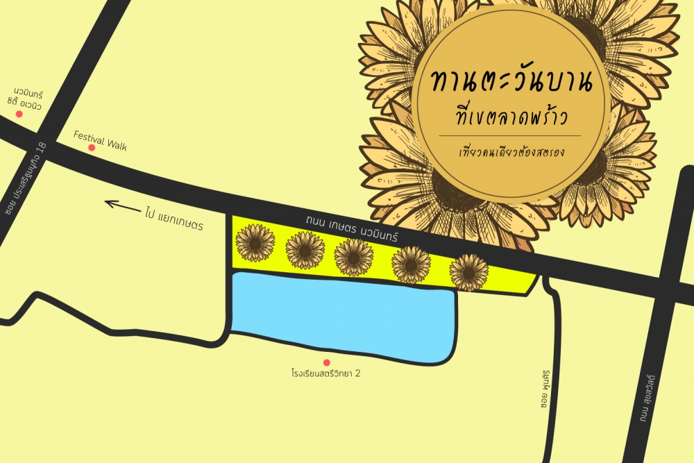 หลายคนอาจจะเคยมาแล้ว แต่สำหรับใครยังไม่เคยมา ลองดูแผนที่ได้เลยครับ ใครขับรถมาเอง ขับเลยไปทางใต้สะพานสักหน่อย มีทางเข้าให้ลงไปจอดรถริมบึงได้นะครับ ช่วงนี้ดอกทานตะวันบานแล้ว มีพ่อค้าแม่ค้ามาขายอาหาร แถม เขตลาดพร้าวยังทำเต้นท์ ทำแคร่ ให้นั่งพักชิวๆ (ถ้าอากาศร้อนไม่น่าจะชิว นี้ไปตอนเที่ยว โอ้โหๆๆๆๆๆๆๆๆ ร้อนมว๊ากกกกกกกก)