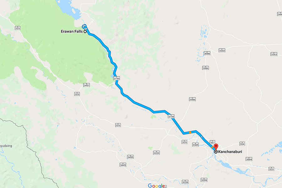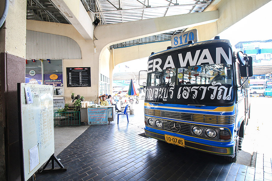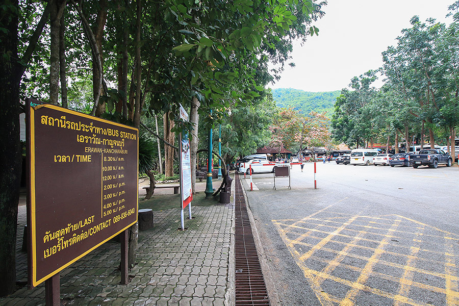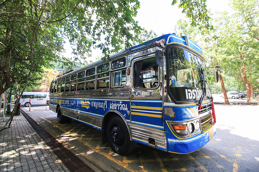 - เดินทางไปน้ำตกเอราวัณง่ายๆ ขึ้นรถโดยสาร กาญจนบุรี-เอราวัณ ที่บขส. กาญจนบุรี รถสุดท้ายที่ลานจอดรถภายในอุทยานฯ