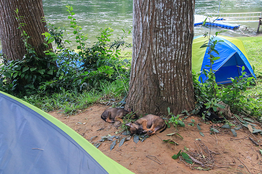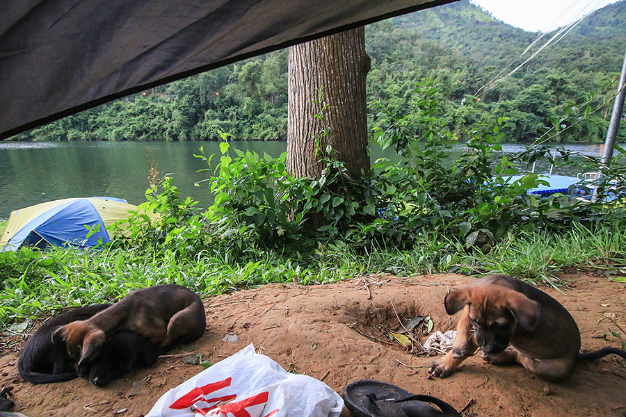 เช้าวันใหม่ท้องฟ้าสดใส ตื่นเพราะเสียงร้องปลุกของลูกหมาสามตัว ท่าทางจะหิว ผมเดินไปล้างหน้าแปรงฟันพวกมันก็วิ่งตามไปเฝ้าหน้าห้องน้ำ แต่ของกินหมดแล้ว ร้านค้ายังไม่เปิด เลยเดินไปถามเต็นท์อื่นว่าพอมีเศษอาหารอะไรบ้างหรือเปล่า เขามีอาหารหมาเลยแฮะ บอกผมว่าไปกางเต็นท์ที่ไหนก็เจอหมาจรทุกครั้ง เลยพกไว้ให้พวกมันโดยเฉพาะ