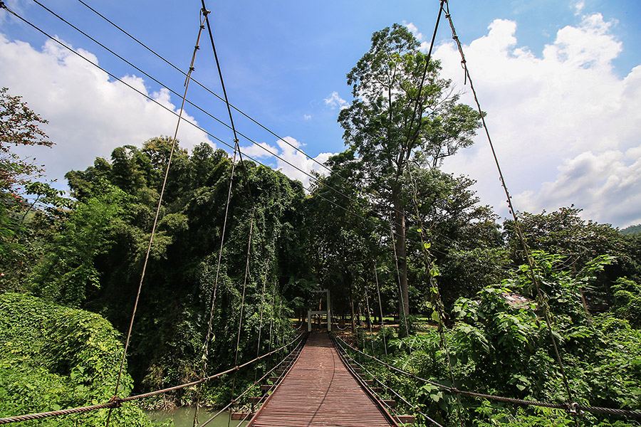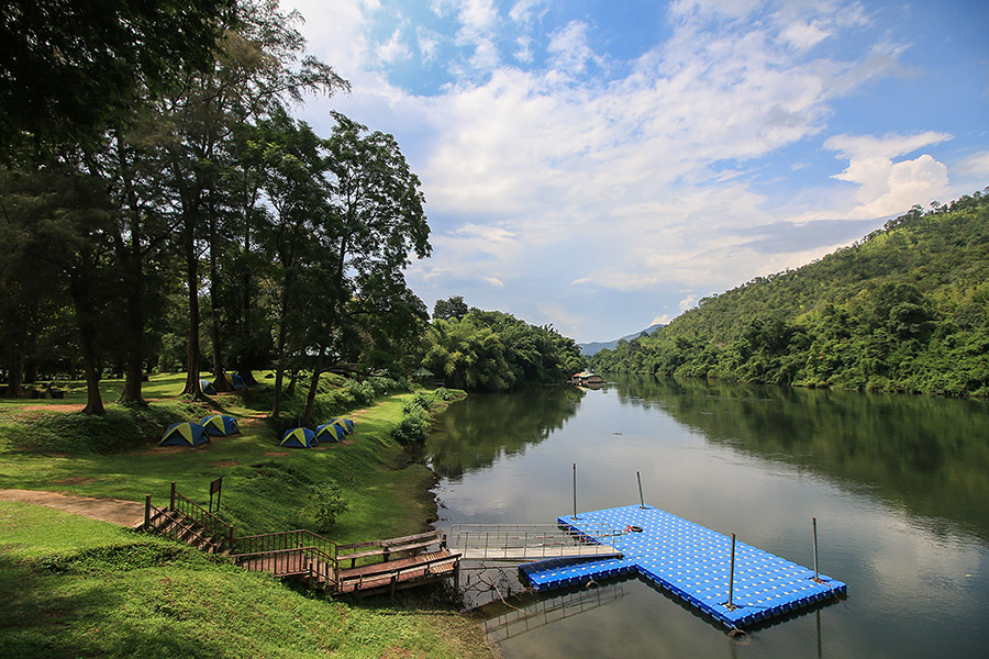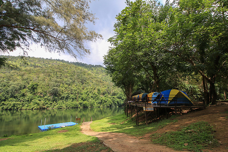 ติดต่อเสร็จแล้วก็เดินไปกางเต็นท์กันดีกว่า ข้ามสะพานแขวนห้วยม่องไล่ ลานกางเต็นท์ที่นี่สวยและเป็นระเบียบร่มรื่นดี มีโซนติดริมน้ำแควใหญ่ด้วย ห้องน้ำแยกชาย-หญิงสองจุด (แค่งงนิดว่าสร้างห้องน้ำใหญ่โตมีห้องน้ำยี่สิบกว่าห้องแต่ทำไมดันมีห้องอาบน้ำห้องเดียวซะงั้น) ตรงศาลาอเนกประสงค์มีปลั๊กไฟให้ชาร์ตไฟกัน