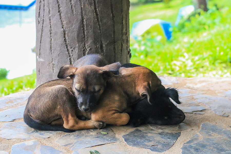 ไปถึงศาลาชมวิวที่ลานกางเต็นท์เจอลูกหมาแค่ตัวเดียว เลยเดินหาอีกสองตัว ปรากฏว่าไม่ได้อยู่ไหนไกลเลย นอนรออยู่ตรงเต็นท์ผมเอง มันจะอ้อนกันเกินไปแล้ว (ฮา...) คลุกข้าวให้กิน ฟาดไม่เหลือแม้กระทั่งแตงกวา แสดงว่าหิวจัดจริงๆ จากนั้นพวกมันก็นอนเล่นนั่งเล่นวิ่งเล่นอยู่รอบเต็นท์ผมนั่นแหละ รองเท้าแตะถอดเอาไว้ก็โดนงาบไปซะไกล ถุงขยะก็คุ้ยกระจัดกระจาย แต่ถามว่าโกรธไหม ไม่เลยสักนิด
