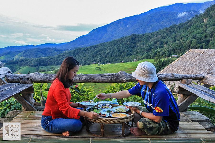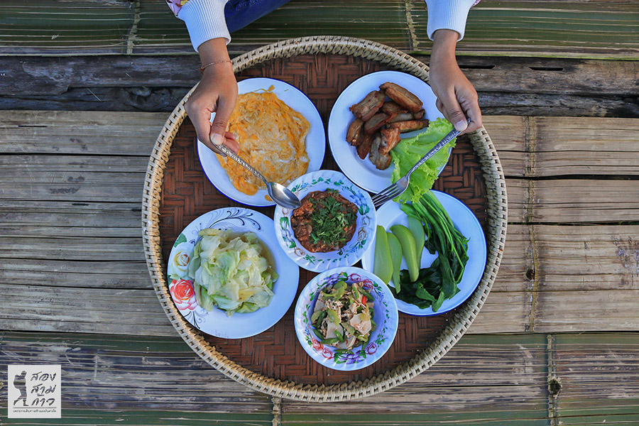 กลับจากทุ่งนาก็มีสำรับมารออยู่ตรงระเบียงบ้าน ผัดผัก หมูทอด ไข่เจียว ยำปลากระป๋อง ถึงไม่ใช่อาหารถิ่นอะไรแต่ก็รสชาติอร่อย กินกับวิวสวยๆ อิ่มเชียว