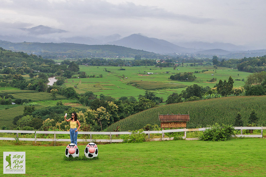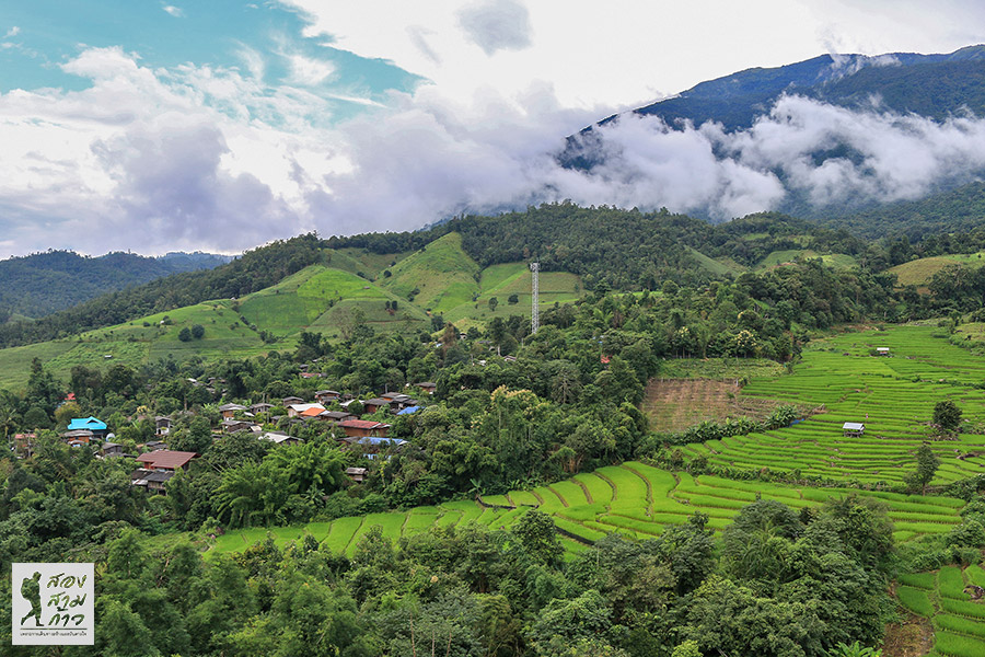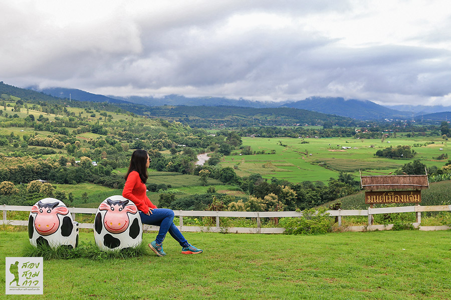 ขี่ไปเรื่อยๆ ฝนตกปรอยๆ เป็นระยะ ก่อนถึงตัวอำเภอแม่แจ่มไม่นานก็เจอป้าย มนต์เมืองแจ่ม เลี้ยวขวา 1 กิโลเมตร ทำเอารีบแตะเบรกเลยทีเดียว เพราะคุ้นๆ เคยอ่านข้อมูลเจอว่าที่นี่น่าพักและเป็นจุดชมวิวสวยดี ไหนๆ เราก็ยังไม่มีที่พักลองเลี้ยวรถเข้าไปดูสักหน่อยจะเป็นไร