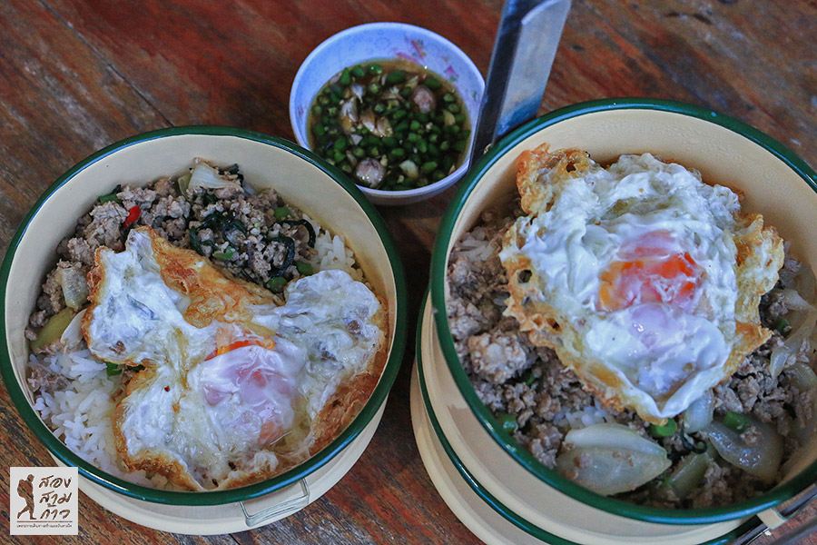 ที่นี่ไม่มีบริการอาหาร แต่เพราะเรามีแค่สองคนเลยขอให้เขาทำให้หน่อย อะไรก็ได้แบบง่ายๆ เลยจบที่กระเพราหมูสับไข่ดาวสองกล่อง กล่องละ 30 บาท สบายกระเป๋าไป