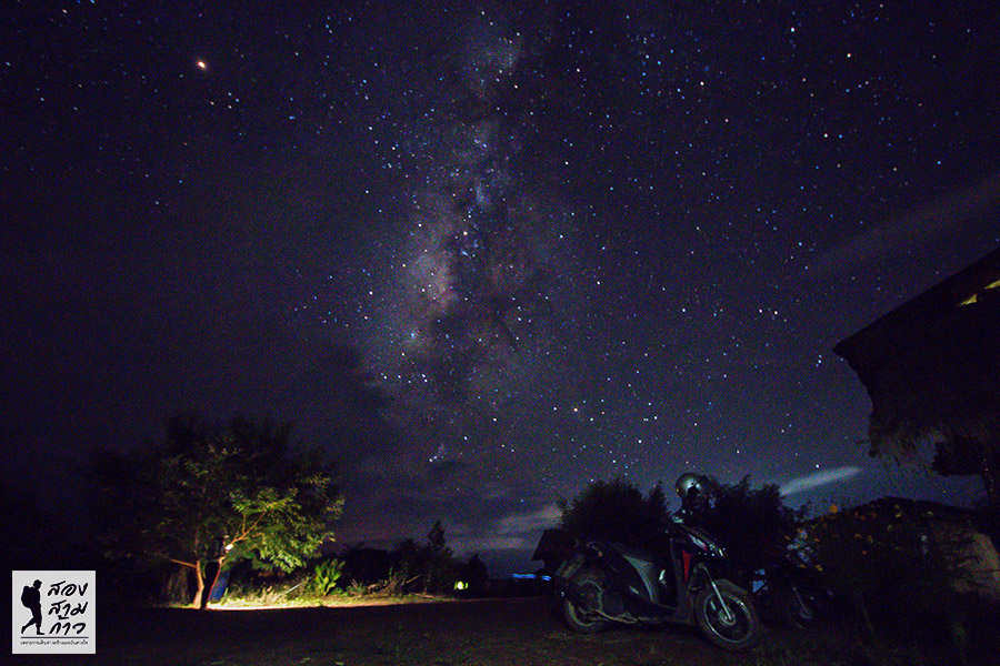 ช่วงค่ำเมฆครึ้มเชียว ผมไม่ได้หวังจะเห็นดาวอะไรหรอก อาบน้ำอาบท่านั่งอาบลมอยู่ระเบียง สักสามทุ่มปรากฏว่าลมแรงมีจังหวะฟ้าเปิด โอ้โฮ ดาวระยับมาก ทางช้างเผือกเผยให้เห็นแบบชัดเจนด้วยตาเปล่า รีบตั้งกล้องหามุม ถ่ายภาพมาแชะแรกโฟกัสยังไม่เข้า กดแชะอีกรอบเมฆก็มาเรียบร้อย แถมฟ้าแล่บอีกต่างหาก