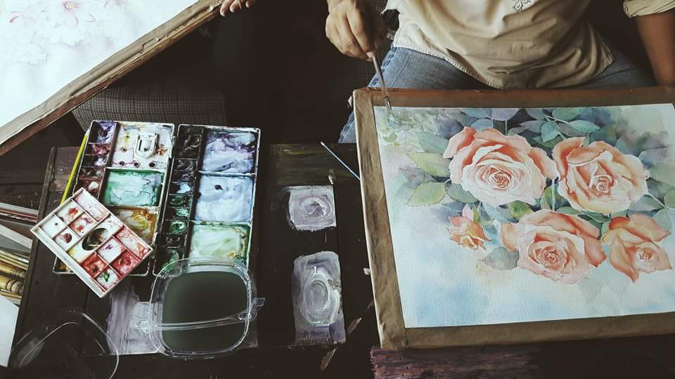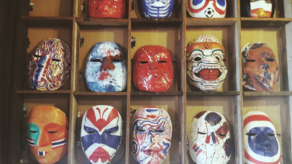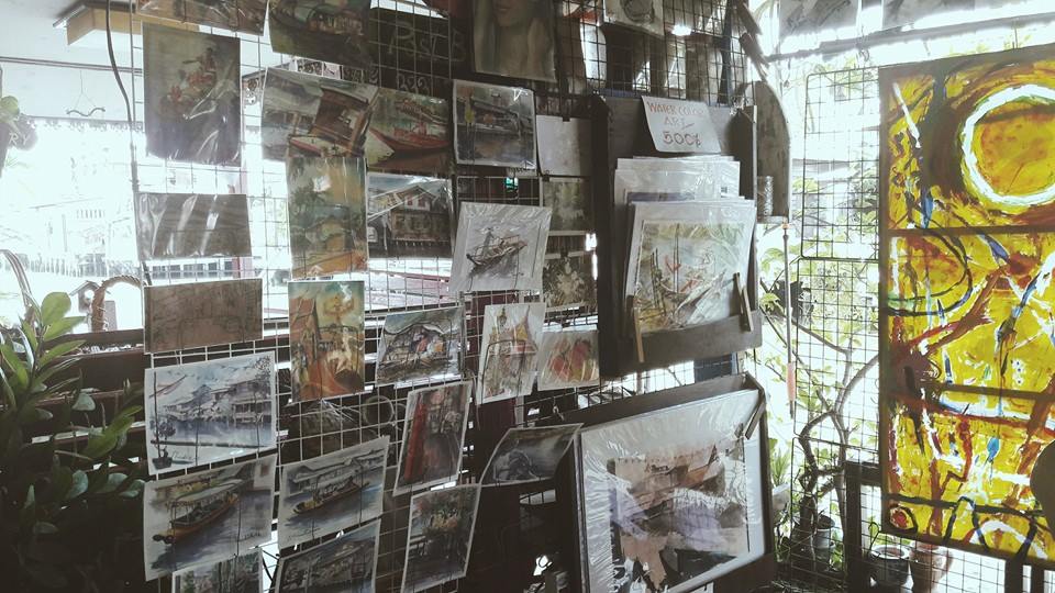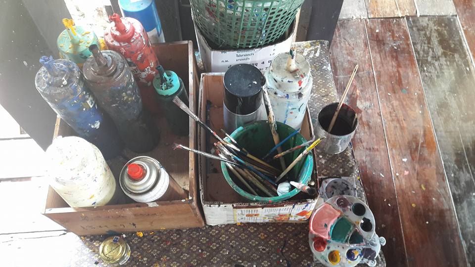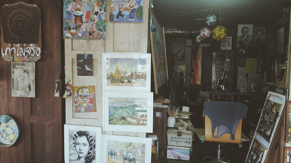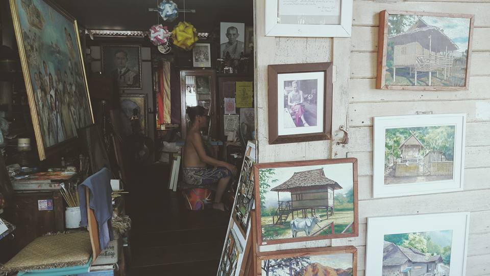 มีให้เราได้ลองระบายสีหน้ากากแบบนี้ด้วยนะ มีงานศิลปะอีกหลายอย่างที่ให้เราได้ลองทำด้วย เปิดสอนวาดรูป งานประดิษฐ์ต่างๆ อันนี้ให้มาดูและสอบถามรายละเอียดอีกทีนะ เพราะบางทีอาจเป็นศิลปินท่านอื่นที่ไม่ได้อยู่ประจำมาสอน อ่อ...และยังมีสอนรำด้วย อันนี้ก็ต้องมาสอบถามรายละเอียดอีกทีนั่นแหละ แต่เท่าที่ทราบมา สอนให้เด็กๆนะ     ชั้นบนก็จะมีแกลลอรี่รูปภาพให้ได้ชมและถ่ายรูปกัน อากาศก็จะร้อนๆกว่าข้างล่างหน่อย เป็นห้องโถงโล่งๆ                           เราเอาหนังสือมาอ่านได้ เราเอางานศิลปะมาทำได้ ที่นี่สามารถปล่อยจินตนาการของเราให้โลดแล่นได้ เรียกว่านั่งได้ทั้งวันเลย มีร้านกาแฟเล็กๆ อาหารว่าง ที่สั่งทานได้ตลอดเวลาและราคาไม่แพง หรือหากอยากทานเครื่องดื่มร้านอื่นก็ซื้อและมานั่งทานได้เหมือนกัน คนที่นี่เป็นกันเองมากด้วย เราจะซื้อน้ำปั่น แต่เค้าไม่มีขาย เราก็ไปซื้อมาจากร้านข้างๆแล้วมานั่งกินในบ้านจริงๆ เค้าก็ไม่ว่า แล้วเราก็มานั่งเขียนโปสการ์ดแผ่นละ 5 บาทกันตรงนี้ โปสการ์ดจากบ้านศิลปิน