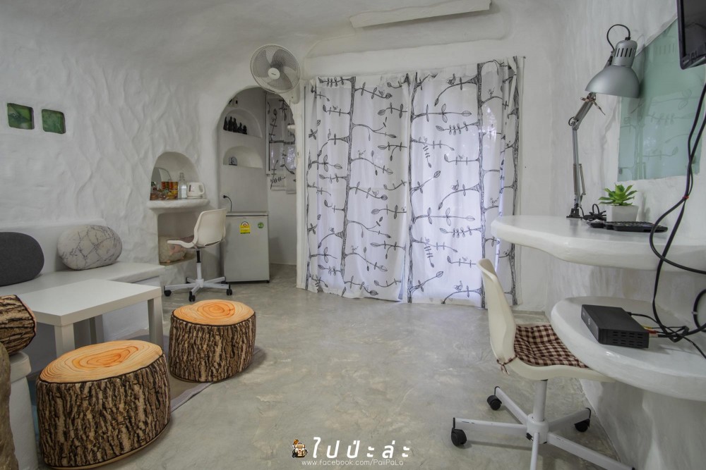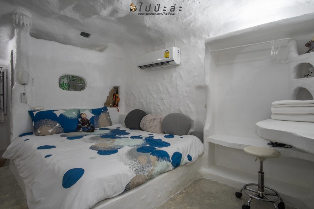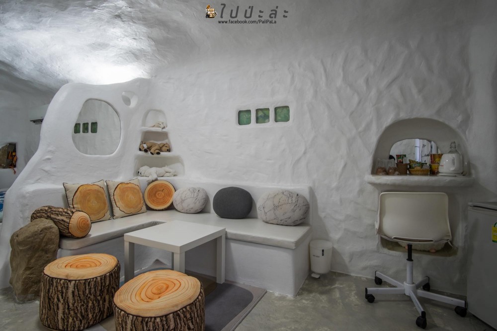 - บ้านถ้ำ ดูจากภายนอกจะเข้าประตูยังต้องก้มหัวเลยแต่พอเข้าไปด้านในเท่านั้นแหล่ะ โอ้ววววว เป็นไปได้ยังไง มันกว้างกว่าที่คิดไว้มาก แบ่งเป็นส่วนของห้องนั่งเล่นและห้องนอนอีกต่างหาก พร้อมห้องน้ำในตัว ภายในจะโบกปูนแบบไม่ให้เรียบครับให้ได้บรรยากาศแบบอยู่ในถ้ำ อ้อบ้านหลังนี้ด้านบนจะเป็นดินแล้วก็ต้นไม้ต้นหญ้าปกคลุมอยู่ครับทำให้ตัวบ้านนั้นไม่ร้อน ไฮไลท์อีกอย่างอยู่ในห้องน้ำครับ เจ้าของออกแบบให้มีน้ำตกเล็ก ๆ ในห้องน้ำด้วยครับเผือใครอยากได้บรรยากาศการอาบน้ำแบบเล่นน้ำตก