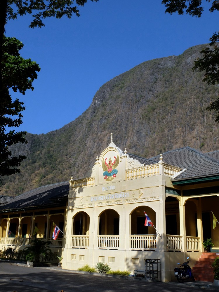 ถัดจากถ้ำพุงช้าง เข้าเมืองไปไม่ถึงหนึ่งกิโลเมตร อาคารเก่าแก่ศิลปะอย่างตะวันตกสีเหลือง ตั้งตระหง่านอยู่เชิงขุนเขาที่ทอดตัวยาวคล้ายช้างกำลังหมอบ