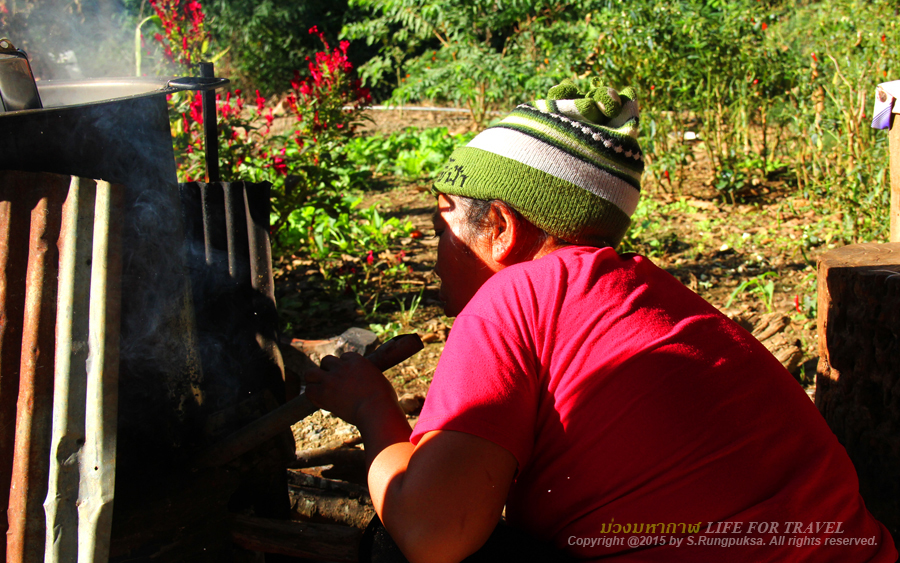 คุณยายกำลังง่วนกับการเป่าเตาไฟต้มน้ำก๋วยเตี๋ยวอยู่พอดี