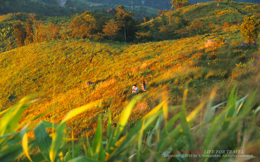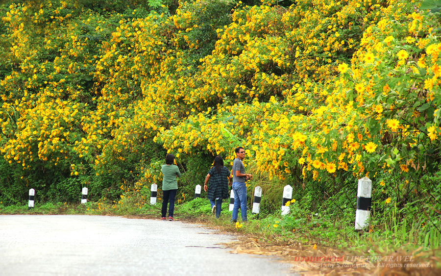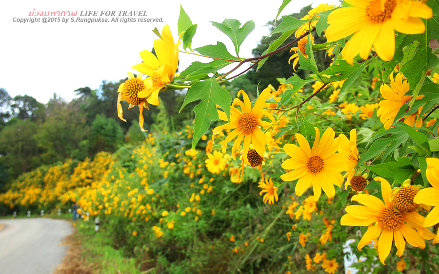 เส้นทางที่ลัดเลาะไปตามไหล่เขา ยามนี้ยังคงมีดอกบัวตองให้เห็นเป็นระยะๆ