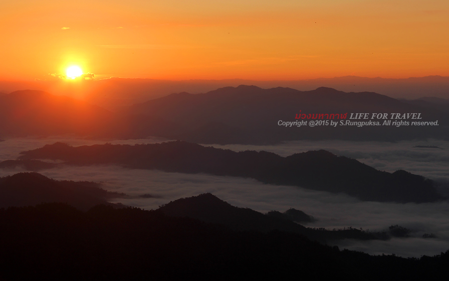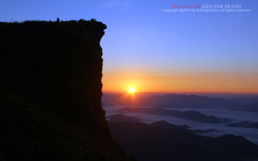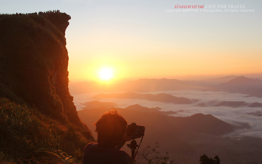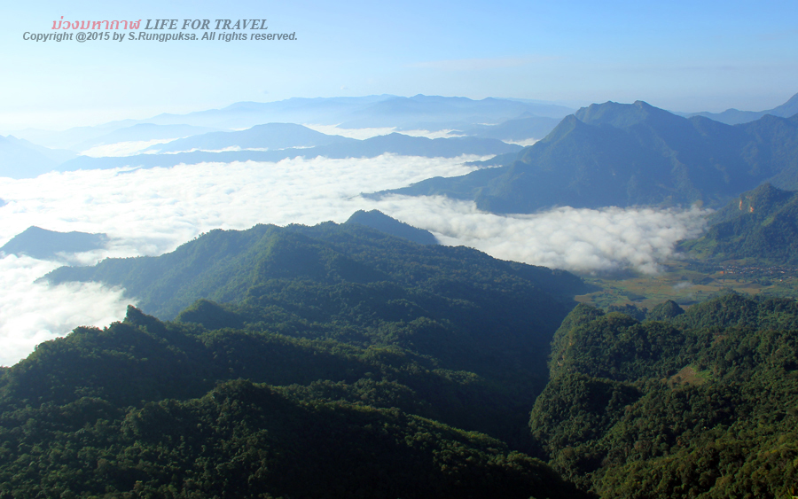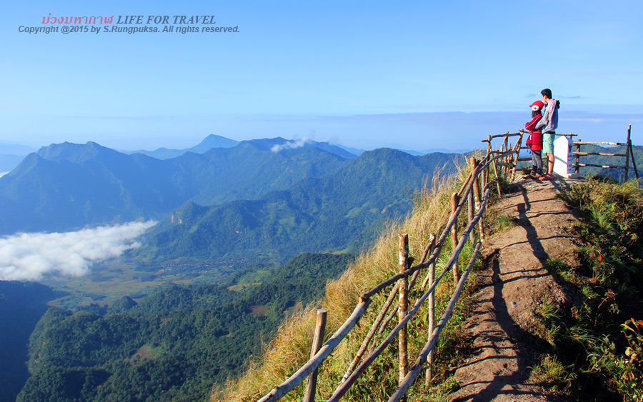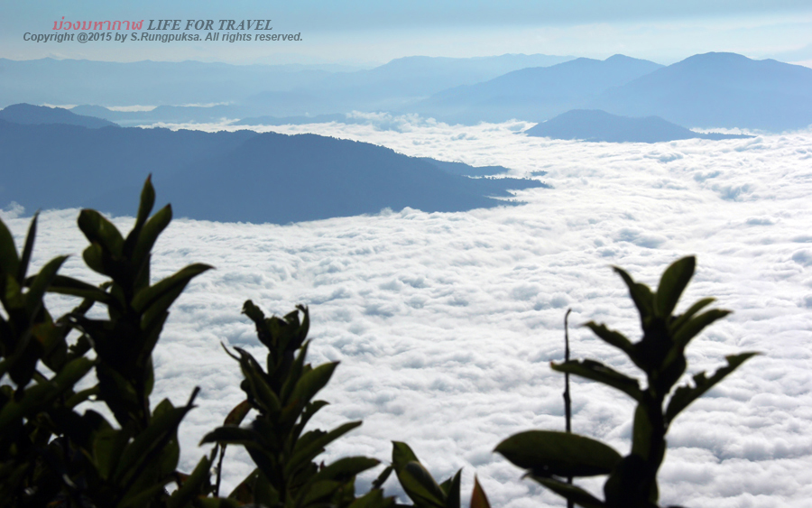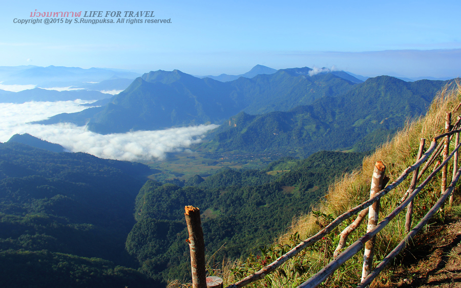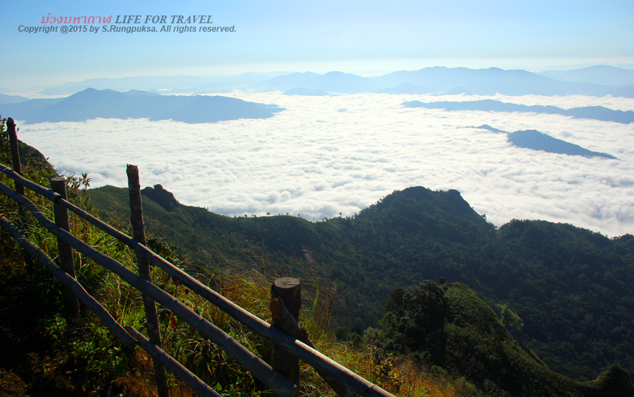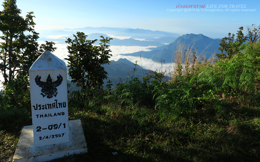หลักเขตบ่งบอกเขตแดนอย่างชัดเจน จุดที่พวกเรายืนคือสยาม ส่วนทะเลหมอกด้านล่างคือประเทศลาว