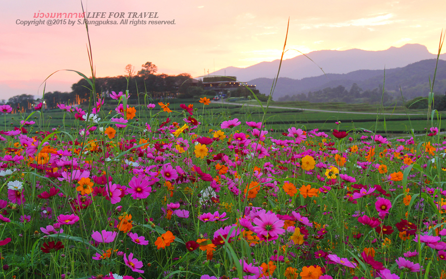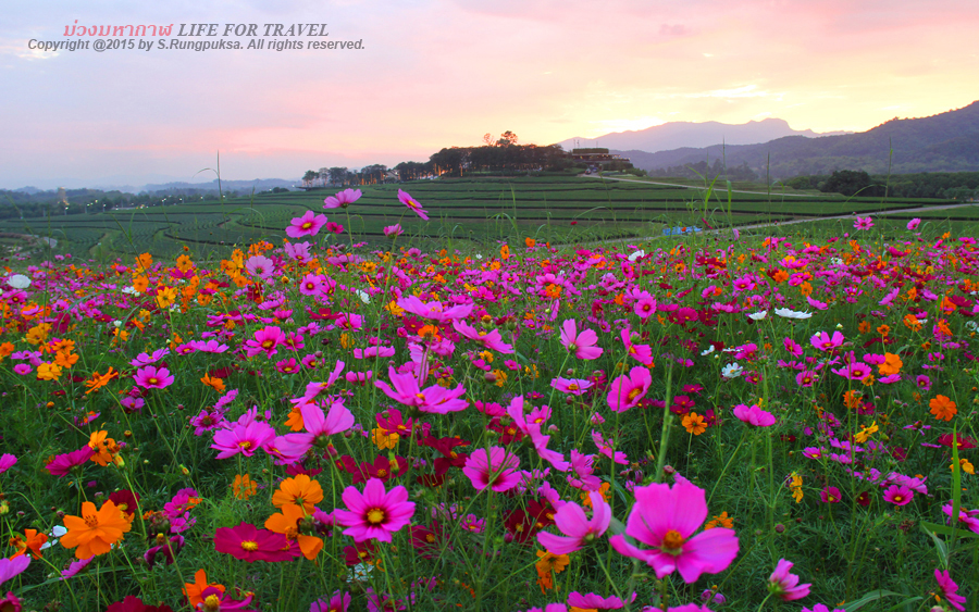 ทุ่งดอกคอสมอสที่ปลูกบนเนินเขาเล็กๆ