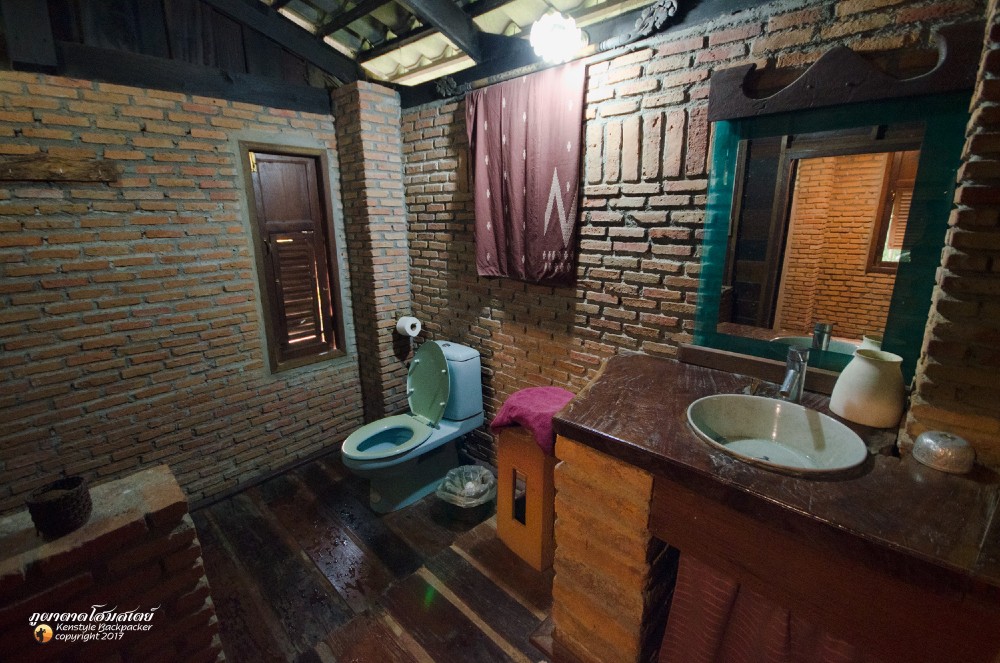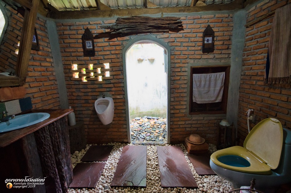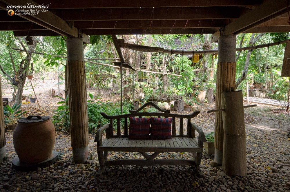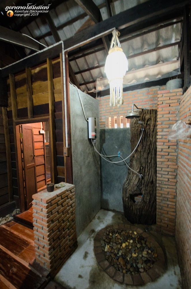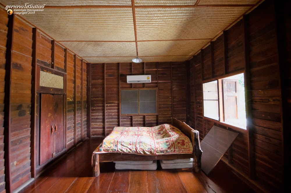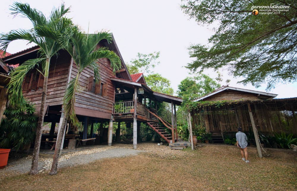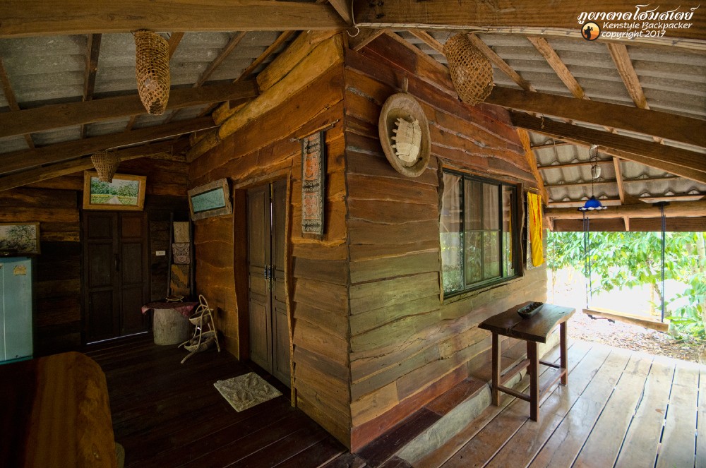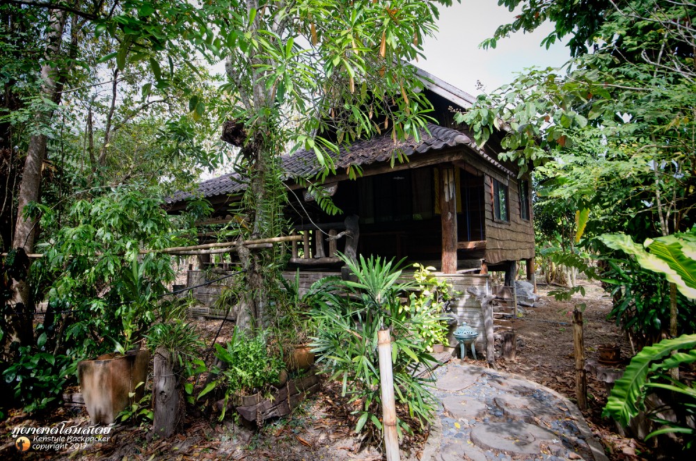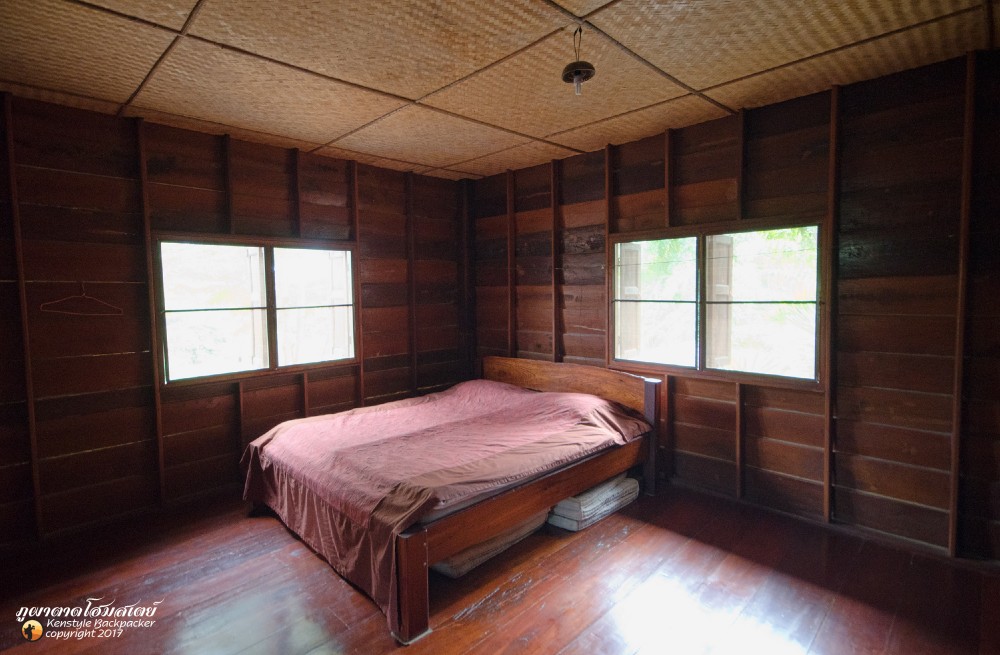 บ้านหลังนี้เป็นหลังที่ผมเข้าพัก เป็นบ้านแฝด 2 หลังสร้างติดกันมีชานบ้านตรงกลางเชื่อมระหว่างบ้าน 2 หลัง และมีศาลาไว้นั่งพักผ่อนหย่อนใจ พอก้าวขึ้นไปบนบ้าน เข้าไปในห้องพบว่าซอยย่อยเป็นห้องนั่งเล่นเล็กๆสำหรับดูทีวีก่อนจะถึงตัวห้องนอน ส่วนห้องนอนวางเตียงใหญ่ได้ถึง 2 เตียง กว้างมากๆ ห้องน้ำสไตล์รีสอร์ท ผนังเป็นอิฐมอญโชว์ลายดิบๆ ฝักบัวซ่อนอยู่ในต้นไม้ พื้นตรงบริเวฯที่อาบน้ำโรยด้วยก้อนกรวด เผื่อไว้นวดเท้าเวลาอาบน้ำ บริเวณชักโครกมีบานหน้าต่างไว้เปิดชมวิวหากนั่งนานไปหน่อย..บ้านหลังนี้เกิดจากมีไม้เหลือ ลุงหมึกอยากสร้างเพิ่มอีกหลังเพื่อขยับขยาย โดยการขายที่บางส่วนออกไปเพื่อเอามาเป็นค่าแรงในการปลูกบ้านหลังนี้