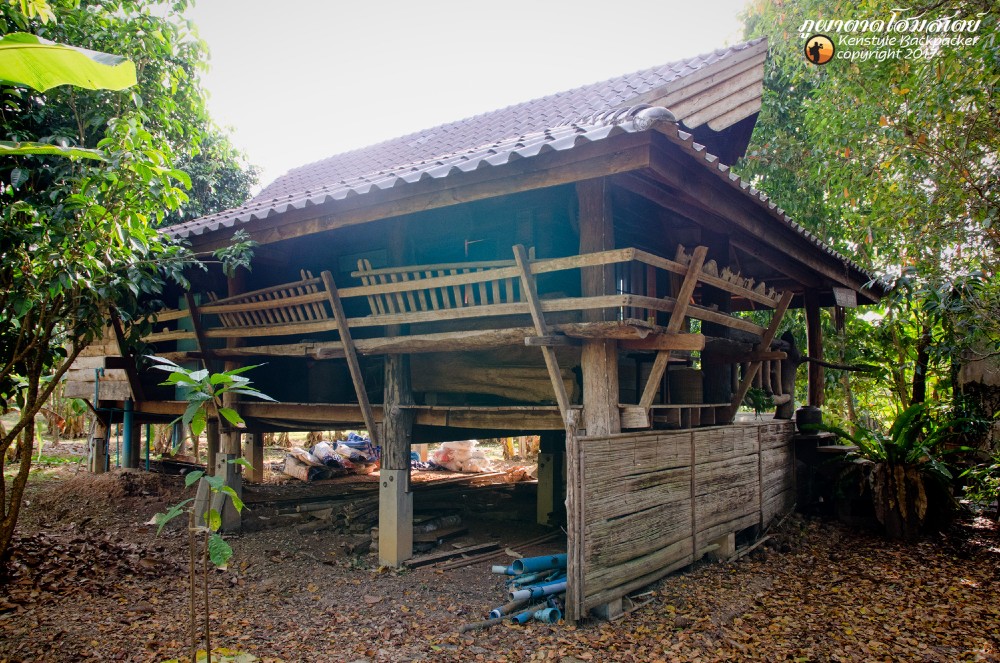 หลังจากปลูกบ้านหลังใหญ่มาสองหลังแล้ว ลุงหมึกอยากสร้างหลังเล็กๆบ้างสำหรับคู่รัก แต่ไม้ไม่พอและทุนน้อยก็เลยเอาไม้ที่เหลือมาซอยย่อย มาผ่าเป็นชิ้นๆ (ภาษาช่างเรียกว่าหนังหมู)เลยได้เป็นบ้านหลังเล็กดูอบอุ่นเหมาะกับคู่รักเป็นอย่างดี