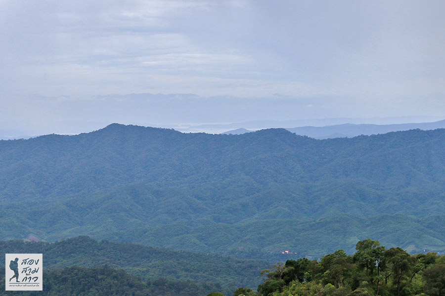 ฟ้าเปิดทำให้เรามองอีกฝั่งเห็นไกลถึงเขื่อนสิริกิติ์อยู่ลิบๆ เลยเชียวล่ะ ส่วนด้านล่างภูเขาจะเห็นหลังคาแดงๆ เล็กๆ นั่นคือวัดต้นขนุน ใกล้กับจุดเริ่มต้น หน่วยพิทักษ์ฯ ที่เราเดินมานั่นไง