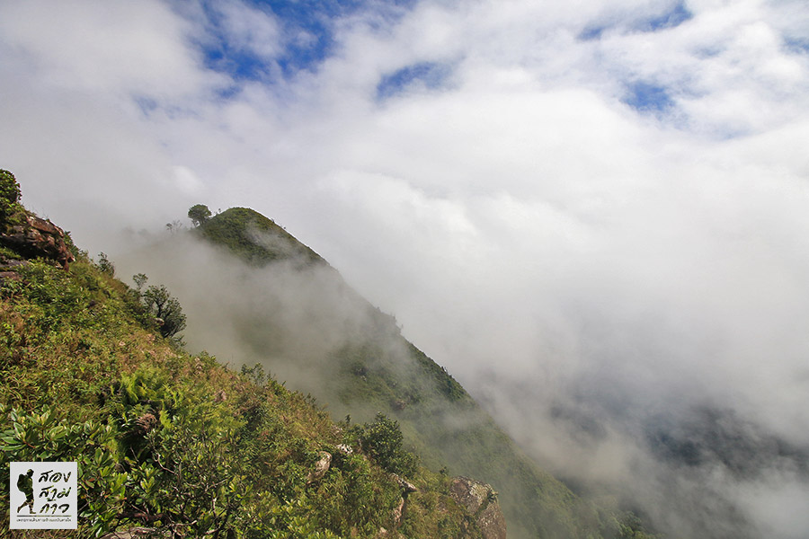 ไต่ระดับขึ้นกันต่อ ผาที่ 2 ผาแดง หากอยู่ตรงจุดกางเต็นท์จะมองเห็นผานี้ชัดเจนทีเดียว หมอกมาๆ ไปๆ ตามลม มีช่วงที่บางลงเลยได้เห็นยอดที่สองของภูเมี่ยงด้วย