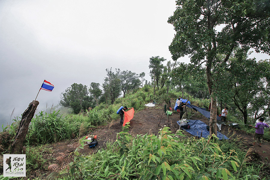 จุดกางเต็นท์ของเราเป็นอย่างที่เห็นครับ ที่ราบสันเขาขนาดกำลังดี ถึงตรงนี้เจ้าหน้าที่กับลูกหาบจะไปเอาน้ำมาให้ซึ่งต้องเดินลงไปสองกิโลแล้วขึ้นอีกสองกิโล ไกลโขขนาดนี้คงตามไปด้วยไม่ไหว (ฮา...) คงทำได้เพียงช่วยกันตั้งแคมป์กางเต็นท์ ต้มมาม่ากินเป็นมื้อกลางวันตามเรื่องตามราวของเราไป