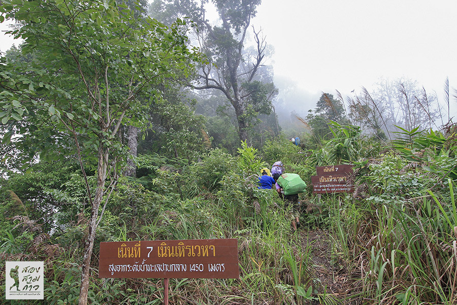 และเนินที่ 7 เหินเวหา เหนื่อยถึงตรงนี้ต้องขอแสดงความยินดีแล้วล่ะ เพราะขึ้นเนินอีกไม่เกินสิบนาทีก็ถึงจุดกางเต็นท์ เท่ากับว่าจากแคมป์แรกมาแคมป์สอง ใช้เวลาประมาณสองชั่วโมงเท่านั้น