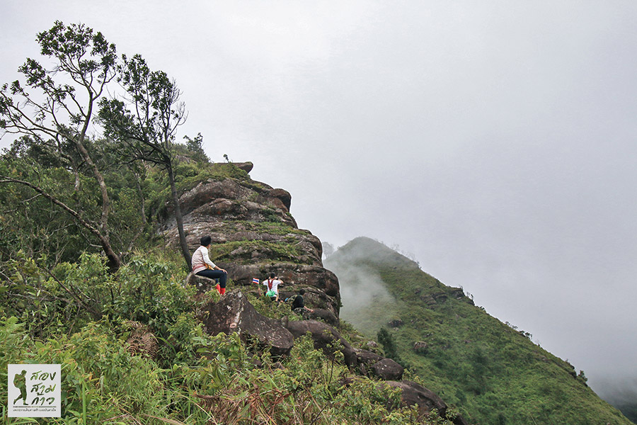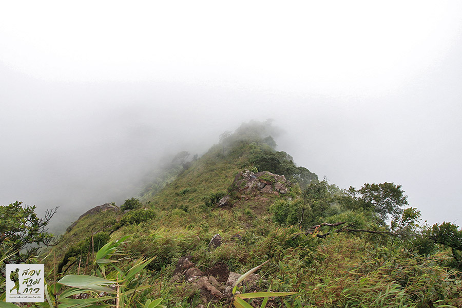 สุดเนินที่ 5 คือแนวสันเขา เป็นครั้งแรกที่เราพ้นแนวป่าขึ้นมา และเป็นจุดแรกที่มีสัญญาณโทรศัพท์ครับ ของทรู กับเอไอเอส เล่นเน็ตได้เลยล่ะ เจ้าหน้าที่บอกว่าถ้าฟ้าเปิดจะมองเห็นยอดภูเมี่ยงอยู่ข้างหน้า น่าเสียดายตอนนี้หมอกยังขาวโพลนมองไม่เห็นอะไร
