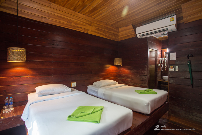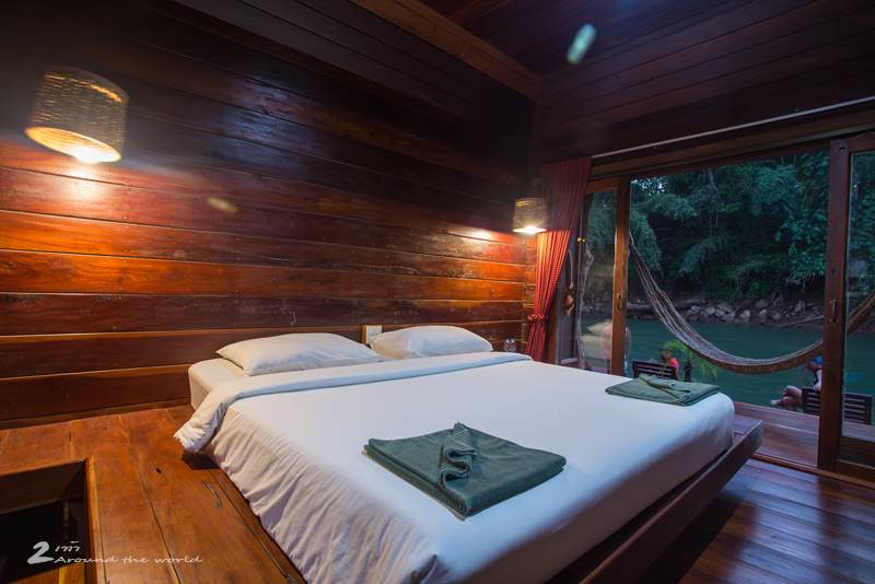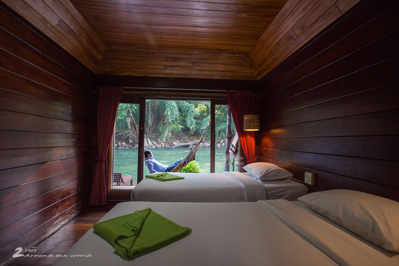 ไปดูห้องแบบ Twin bed กันบ้าง การออกแบบในห้องเหมือน Double bed ทั้งหมด แตกต่างที่เตียงแยกเท่านั้น ทุกห้องมีเปลญวนผูกไว้ที่หน้าห้อง รวมถึงเสื้อชูชีพจะแขวนไว้ที่หน้าห้องพักเลยครับ และที่พิเศษไปกว่านั้น แต่ละห้องจะมีเตียงไม้ให้แขกได้นอนเอนหลังบริเวณหน้าห้องพักด้วย เรียกว่าได้สัมผัสกับสายน้ำแบบใกล้ชิดมากๆ ครับ