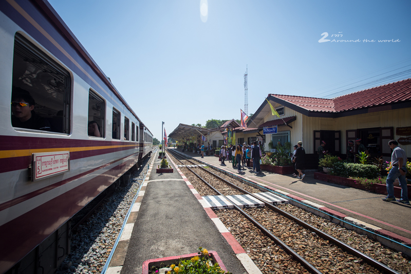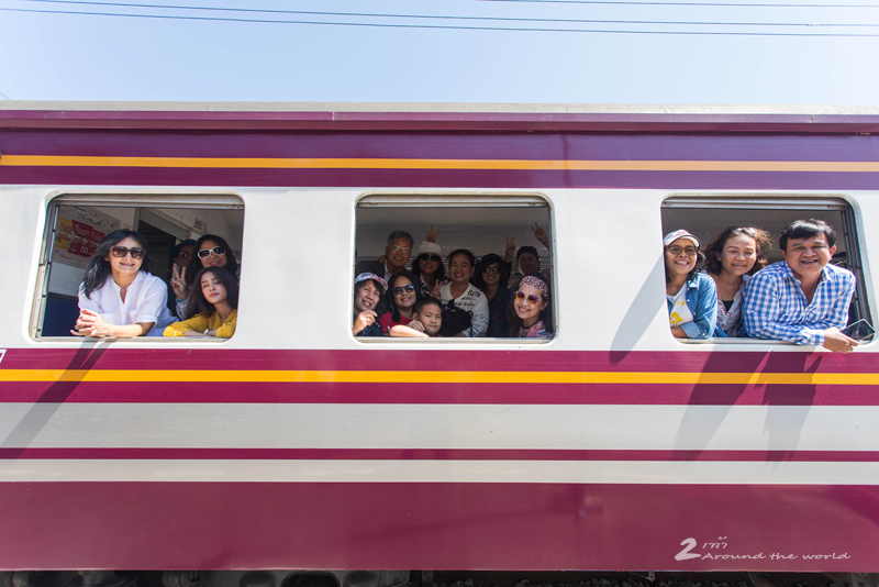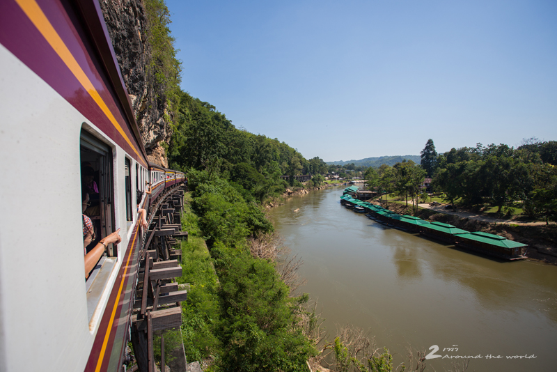 ทริปนี้ผมมีโปรแกรมได้นั่งรถไฟ เพื่อไปสัมผัสกับเส้นทางรถไฟสายมรณะด้วย จากสะพานข้ามแม่น้ำแควผมมุ่งหน้าสู่สถานีรถไฟกาญจนบุรี เพราะผู้จัดได้จองตั๋วรถไฟตู้พิเศษ (เนื่องจากต้องการให้ทั้งคณะได้นั่งตู้เดียวกัน) เนื่องจากความพิเศษ ค่าโดยสารเลยแพงเป็นพิเศษด้วยเช่นกัน (ค่าโดยสารราคา 100 บาท) โดยตู้พิเศษนี้จะรอต่อขบวนกับรถไฟธรรมดา ที่มาจากสถานีธนบุรี รถไฟจะออกจากสถานีกาญจนบุรีเวลาประมาณ 10.35 น. (หากไม่มีการ delay)  จากนั้นจะจอดรับผู้โดยสารที่สถานีสะพานแควใหญ่ (จุดชมสะพานข้ามแม่น้ำแคว) และแล่นผ่านสะพานประวัติศาสตร์ โดยคณะของผมจะไปลงที่สถานีสะพานถ้ำกระแซ รวมเวลานั่งรถไฟทั้งหมดประมาณหนึ่งชั่วโมงยี่สิบนาที (แต่ถ้าหากใครไม่ได้มาเป็นหมู่คณะ สามารถตีตั๋วขึ้นรถไฟตู้ธรรมดาได้นะครับ โดยจะเสียค่าโดยสาร 12 บาท) อ้อ.. แนะนำว่าตอนที่ขึ้นรถไฟให้เลือกที่นั่งฝั่งที่มองเห็นตัวสถานีรถไฟกาญจนบุรีนะครับ เพราะฝั่งนี้ เวลาที่ถึงช่วงโค้งมรณะ จะมองเห็นแม่น้ำแควน้อย อีกฝั่งจะเห็นแต่หน้าผาครับ