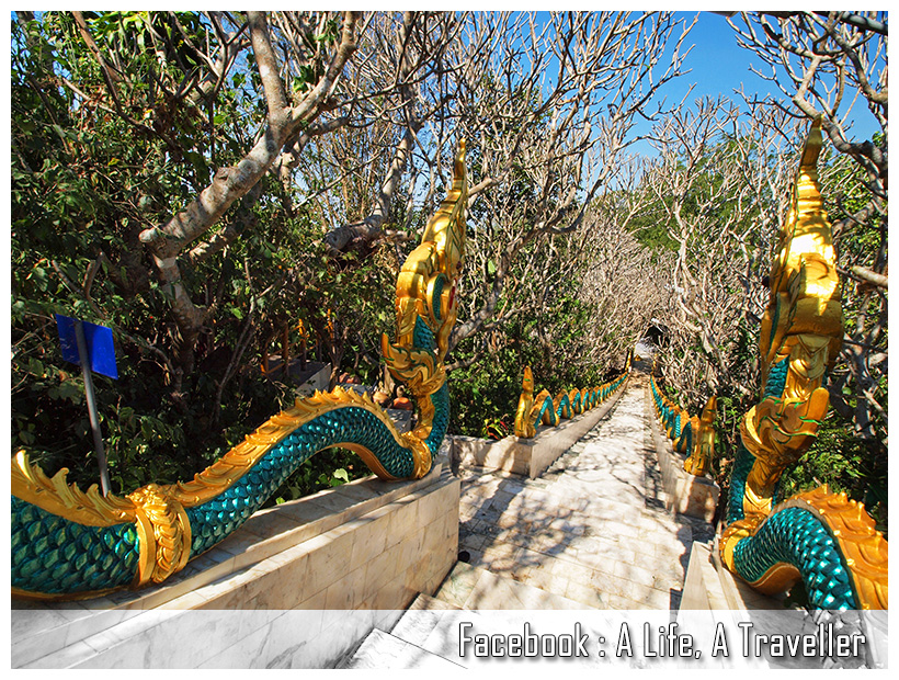 บอกเลยว่าบันไดเกือบสี่พันขั้นต้องก้าวขึ้นทุกก้าว ไม่มีลงและไม่มีทางราบ ยังดีว่าตลอดทางจะมีซุ้มขายของและศาลาให้พักเป็นระยะ แต่บังเอิญผมไปวันธรรมดาเลยมีร้านเปิดร้านเดียว สอบถามได้ความว่าบันไดนี้ทางวัดสร้างมานานกว่า 40 ปีแล้วครับ ปรับปรุงสม่ำเสมอ จนมีสภาพอย่างดีเหมือนที่เห็นในปัจจุบัน