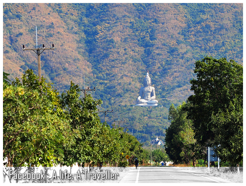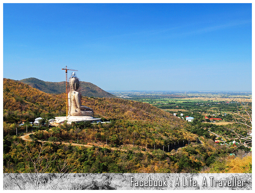 ระหว่างทางเข้าวัดจะเห็นพระพุทธรูปสีขาวองค์ใหญ่ประดิษฐานตรงเชิงเขา แลดูคล้ายกับวัดเทพพิทักษ์ปุณณาราม ที่อำเภอปากช่อง นครราชสีมา ทว่าความจริงองค์พระวัดเขาวงพระจันทร์ไม่ใช่สีขาวนะครับ เป็นปูนเปลือยยังสร้างไม่เสร็จต่างหาก ความตั้งใจของวัดคือปิดทองทั้งองค์ให้อร่ามงามตา กว่าจะเสร็จคงอีกหลายปี เพราะพระองค์ใหญ่สูงกว่า 80 เมตร ต้องระดมเงินทุนบริจาคอีกมหาศาล