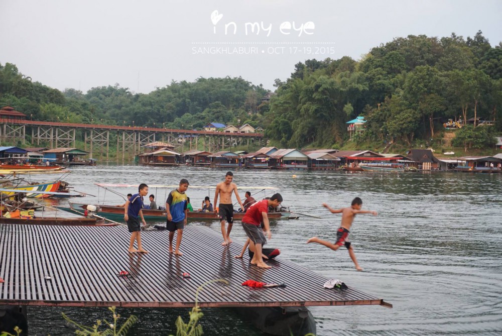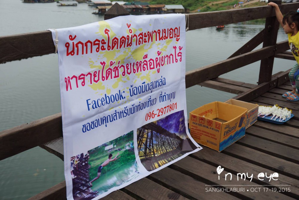 บนสะพานมอญ เค้ามีอะไรกันน่ะ! ทำไม .. คนมุงดูกันเพียบเลย ... วิ่งเข้าไปแจมกับเค้าบ้าง อ๋อ ! โชว์กระโดดน้ำจากบนสะพานมอญ ของน้องมืดสุดหล่อ นี่เอง .. ช่วยกันทำบุญให้น้องๆเค้าหน่อยนะคะ สิบ ยี่สิบบาท แล้วแต่กำลังศรัทธา .. น้องมืดสุดหล่อที่ใครๆเค้าเรียกกัน จริงๆน้องเค้าชื่อ ต้อง ตอนฟังครั้งแรกนะ ฟังเป็น ซ่อง ขำกันกร๊ากเลยค่ะ .. น้องเค้าน่ารัก ยิ่งมุขตลก ให้ นทท. แถวนั้นหัวเราะไปกับมุกของน้องเค้า .. เป็นอีกหนึ่งสีสัน บนสะพานแห่งนี้ น้องจะมาโชว์โดดน้ำ ช่วง 6.40 น. - 9.00 น. ค่ะ .. เราถามน้องเค้าว่า น้ำตรงนี้ลึกกี่เมตร น้องเค้าบอกว่า 4 วาพี่ .. โห ประมาณ 8 เมตร (รึป่าว!?) ตกเลข แหะๆ