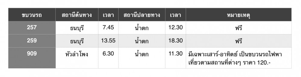 พอถึงสถานีน้ำตก ต้องนั่งรถสองแถวไปลงหน้าน้ำตกไทรโยคน้อย 20 บาท แล้วต้องไปรอขึ้นรถที่ฝั่งตรงข้ามป้ายน้ำตก(ใต้ต้นหูกวาง) จะมีรถที่ไปสังขละผ่านมา ^^