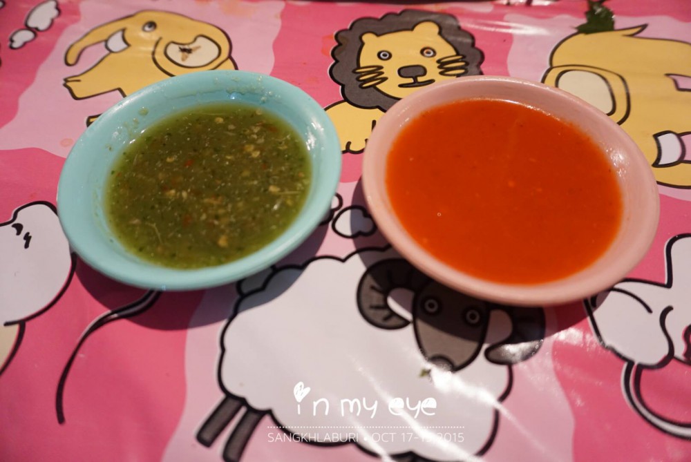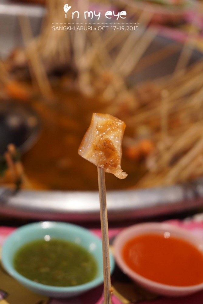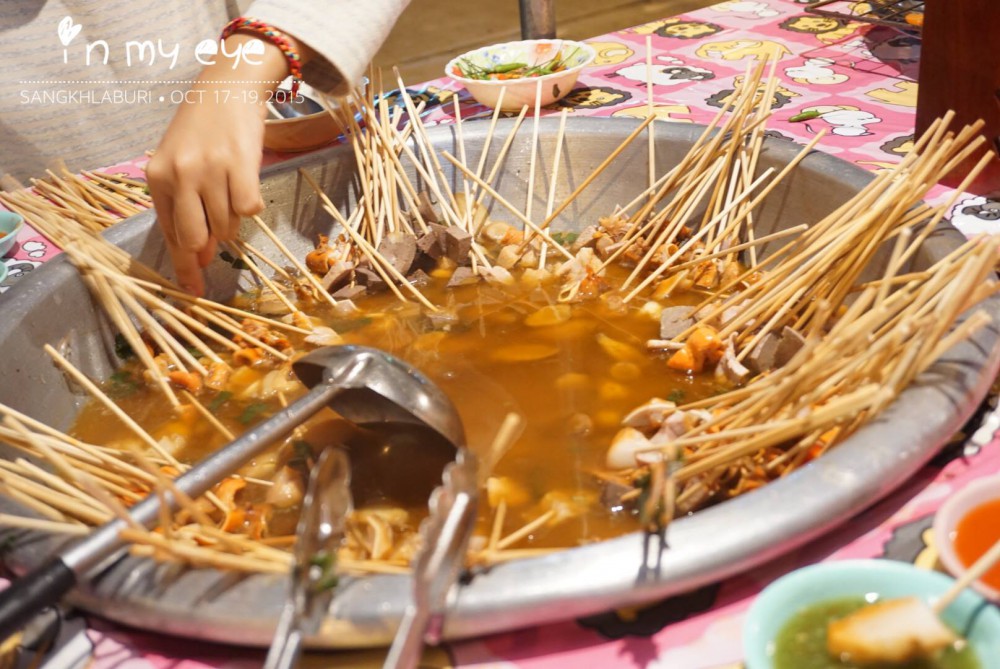 หมูจุ่มพม่า ใครมาถึงสังขละแล้วไม่ได้ลองมาทานถือว่ามาไม่ถึงนะ เจ้าของที่พักบอกเราว่า เจ้าเด็ดที่อร่อยและสะอาด ช่วงนี้เค้าไม่ได้ขาย โหย..เสียใจเลยอดทานเจ้าเด็ด (ลืมถามว่าเจ้าเด็ดน่ะเจ้าไหน ใครไปแวะฝากถามมาด้วยน้า อิอิ) เราเลยลองเจ้านี้ที่ตลาดไปก่อนล่ะกัน คนยืนรอทานเยอะเหมือนกันนะเนี่ย ... ไม้ละบาท เลือกหยิบได้ตามใจชอบว่าจะกินส่วนไหน แต่เราชอบที่สุด ช่วงที่มัน! คิคิ จะเป็นไขมันอุดตันในเส้นเลือดไหมเนี่ย ... ส่วนน้ำจิ้มัให้เลือกทานสองแบบ เลือกว่าอะไรไม่รู้นะ ถ้าเป็นบ้านเราคงเรียกว่า น้ำจิ้มซีฟู้ดกับน้ำจิ้มสุกี้ล่ะมั้ง แต่เราชอบน้ำจิ้มสีเขียวนะ อร่อยดี!