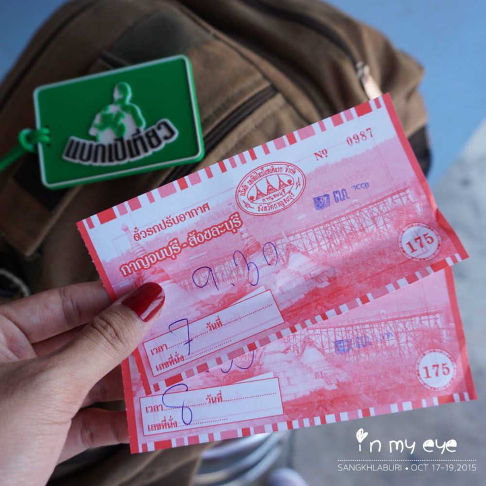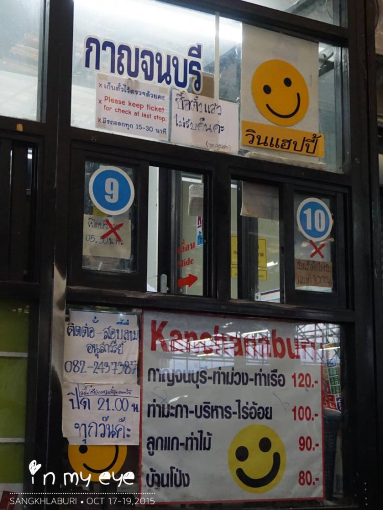เมื่อเรามาถึง บขส.กาญจนบุรี แล้ว ไม่รอช้า รีบมองหาวินรถตู้บริษัทเอเชียไทรโยคในทันที ... ต้องเดินออกมานอก บขส. ตรงที่มีตึกแถว จะเห็นป้ายชื่อบริษัทมาแต่ไกล ไม่รอช้า รีบตรงดิ่งไปจองตั๋วในทันใด .. ค่าตั๋วไปสังขละบุรี อยู่ที่ 175 บาท ส่งถึงตลาดสังขละเลย วินรถตู้นี้ จะฟิคเรื่องที่นั่งมาก นั่งผิดที่ไม่ได้นะจ๊ะ ได้ที่นั่งไหน ที่นั่งนั้นเลย ^^ รถตู้เราออกก่อนเวลาสิบนาที เพราะ ผู้เดินทางมากันครบแล้ว เราเลยได้ออกเวลา 9.20 น. ในระหว่างทางจะมีจุดตรวจของทหารอยู่หลายจุด คอยตรวจบัตรประชาชนผู้เดินทาง อย่าลืมพกบัตรประชาชนติดตัวไปด้วยล่ะ ทางไปสังขละบุรี เป็นทางขึ้นเขา ลงเขา สลับกันไป โค้งเยอะมาก บางจุดถนนเสื่อมสภาพ หากขับรถไปเองขับด้วยความระมัดระวังด้วยนะคะ .. (สัญญาณมือถือก็ไม่มีเป็นบ้างช่วง) .. เรามาถึงสังขละบุรีตรงตลาดตอนประมาณเที่ยงครึ่ง .. ใช้เวลาเดินทาง ประมาณ 3-4 ชั่วโมง .. มาถึงเร็วกว่าที่คิด เย้!
