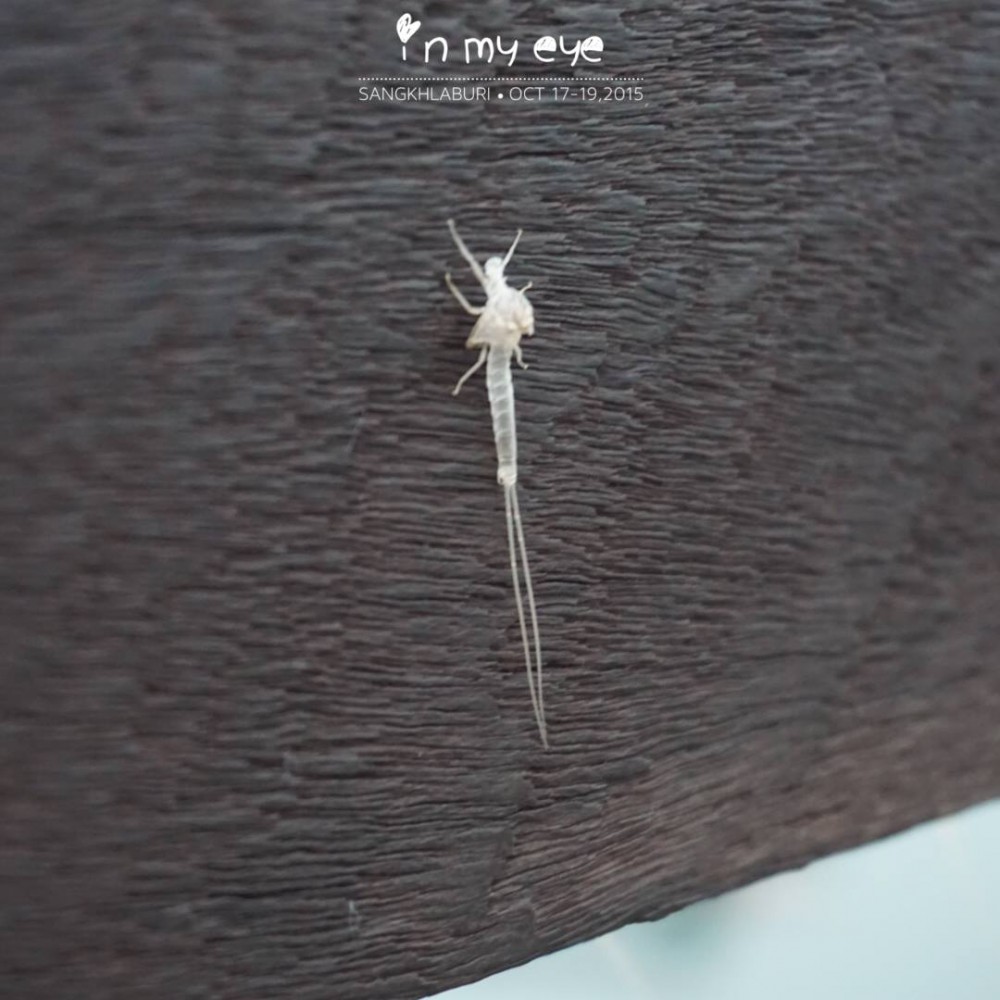 บรรยากาศเช้านี้ ค่อนข้างอึมครึ้ม มีมองบางๆ ลมพัดเย็นสบาย อุณหภูมิ 23 องศาเซลเซียสค่ะ .. ฝูงแมลงอะไรก็ไม่รู้บินเต็มไปหมดเลยค่ะ .. บังเอิญเจอพี่เย็น ดาราสะพานมอญ พี่เย็นบอกว่า นี่คือ แมลงชีปะขาว แล้วพี่เย็นยังบอกอีกว่า วันนี้หมอกไม่สวยเลย แป่ว ~ รูปร่างหน้าตา แมลงชีปะขาว มันเป็นแบบนี้จ๊ะ ถ่ายมาให้ดูกันแบบใกล้ๆเลย ..