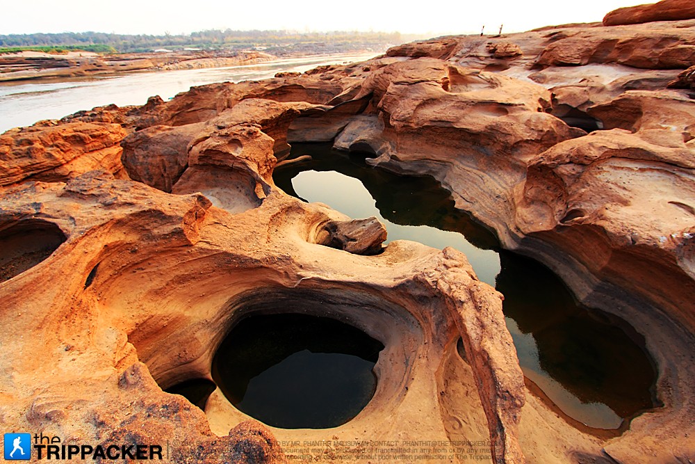 และเมื่อฤดูแล้งมาถึง “สามพันโบก” จะโพล่ขึ้นมาเหนือพื้นน้ำให้เห็นคล้ายเป็นภูเขากลางลำน้ำโขง โชว์ความสวยงามวิจิตรตระการตา ซึ่งหินดังกล่าวจะมีลักษณะและรูปทรงที่แตกต่างกันไปมากมายหลายหลาก เช่น รูปดาว รูปเต่า รูปหนู รูปหัวสุนัข ฯลฯ และด้วยชั้นหินที่กินพื้นที่กว้างใหญ่มาก จึงดูคล้ายกับแกรนด์แคนยอน ประเทศสหรัฐอเมริกา จนมีผู้ขนานนามสถานที่แห่งนี้ว่า “แกรนด์แคนยอนเมืองสยาม สามพันโบกเมืองอุบล”