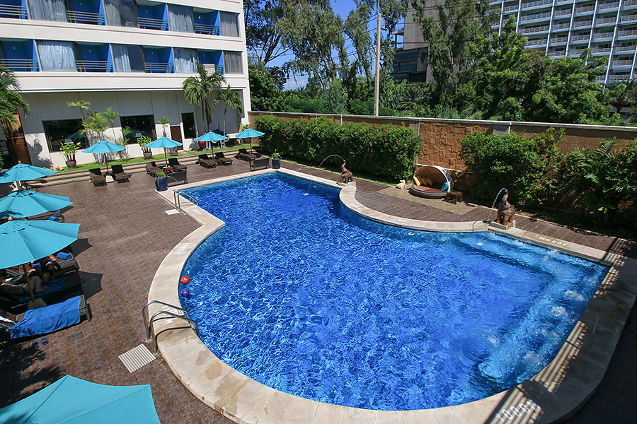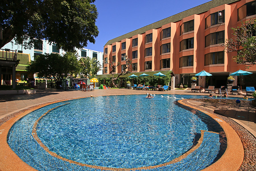 เดินทะลุล็อบบี้จะพบสระว่ายน้ำและสวนหย่อม มีเก้าอี้และโต๊ะให้นั่งพักผ่อนตามมุมต่างๆ ซึ่งการที่โรงแรมถูกโอบล้อมทั้งสี่ด้าน ทำให้ที่นี่ดูคล้ายพื้นที่ในกล่องส่วนตัว ตัดขาดความอึกทึกรอบนอก ไม่เหมือนมาเที่ยวพัทยาเมืองแห่งความคึกคัก คนเบื่อความวุ่นวายคงชอบน่าดู