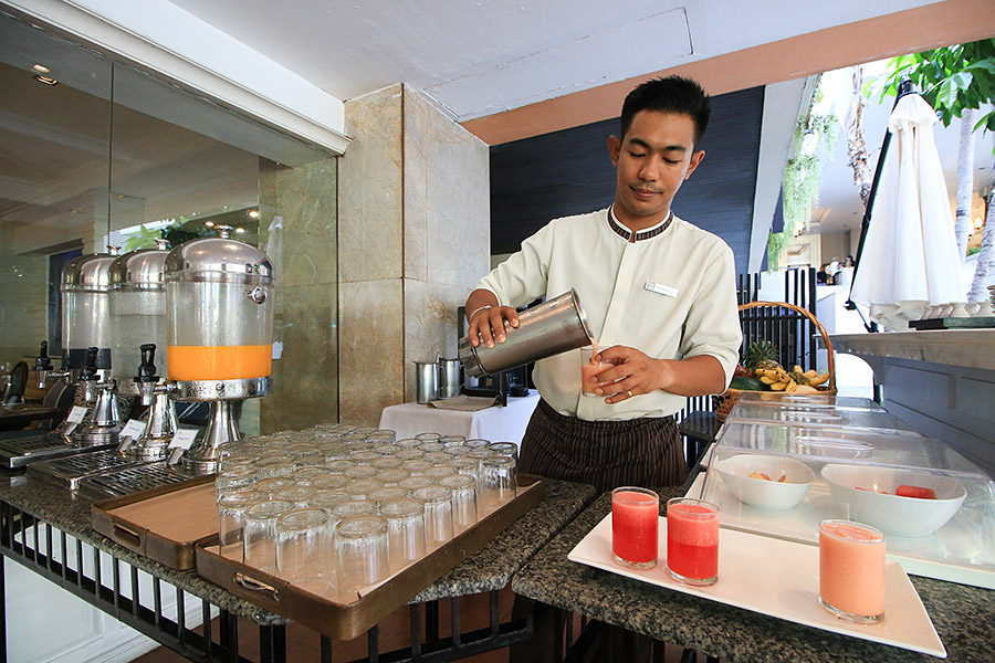 ในส่วนของอาหารเช้าเราทานกันที่ การ์เด้น เทอร์เรซ ไลน์ไม่จัดว่าล้นทะลักแต่ก็มีให้เลือกหลากหลายและเพียงพอ ห้องอาหารสวยดี บรรยากาศโอเค เลือกนั่งได้ทั้งโซนด้านในและด้านนอก ที่นี่มีน้ำผลไม้ปั่นสดๆ ให้ทานกันตามใจชอบด้วย