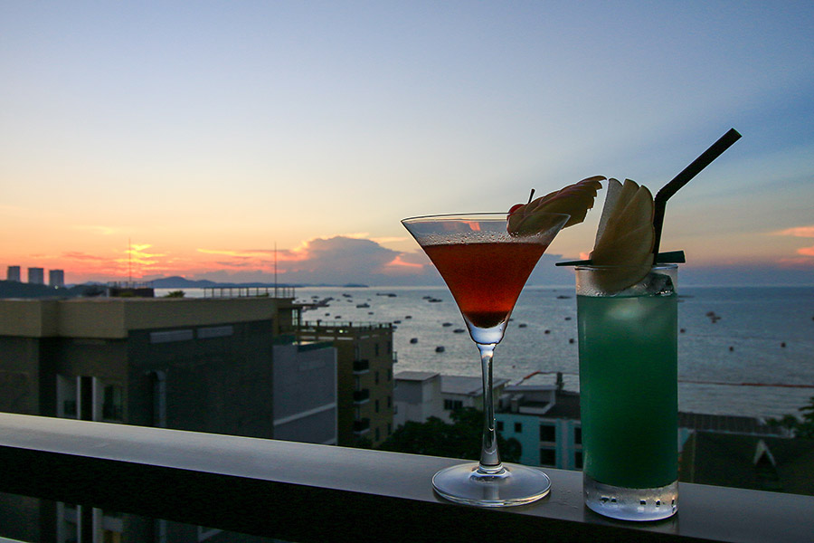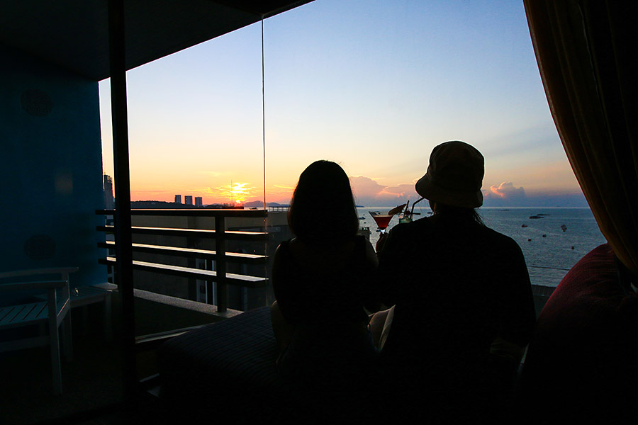 ใกล้เย็นย่ำก่อนพระอาทิตย์ตก ผมสั่งค็อกเทลเย็นๆ ขึ้นมาที่ห้องสองแก้ว เอนกายจิบพวกมันไปพร้อมเอนหลังชมฟ้าเปลี่ยนสี วิวจากห้องพักชั้นแปดทำให้อ่าวพัทยาดูสวยขึ้นอย่างน่าประหลาด ขอบอกว่าชอบนะโมเม้นต์แบบนี้