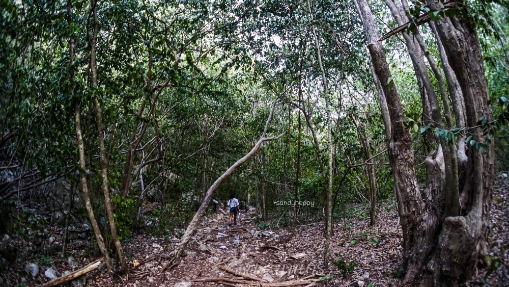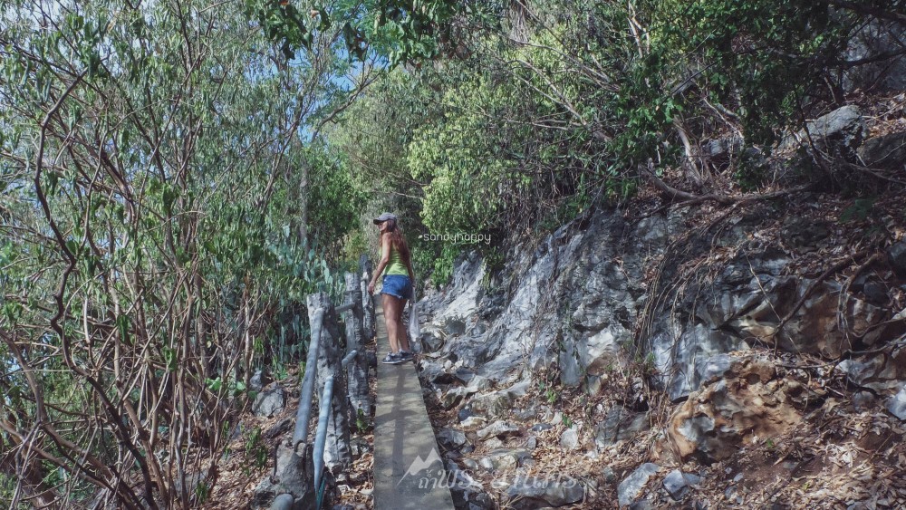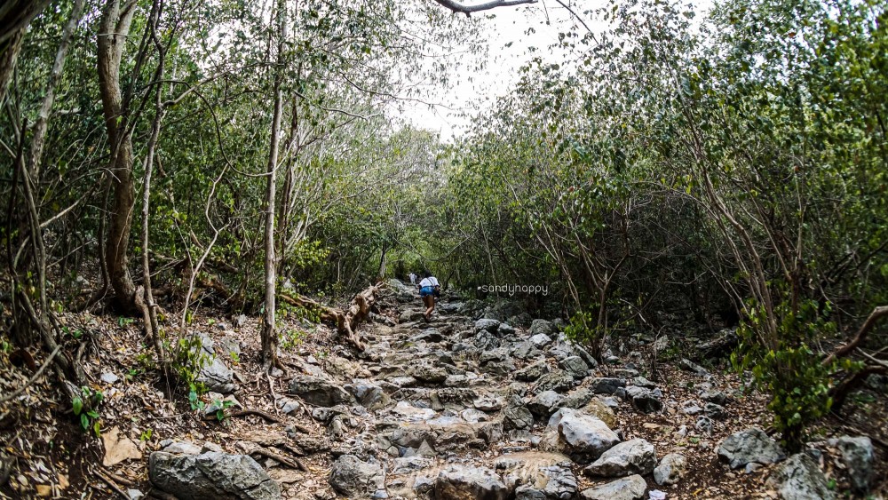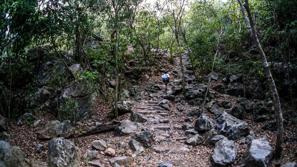 ทางขึ้นอย่างเดียวเลยค่ะ ไม่มีทางลง หรือทางราบเลย ทางเดินตามก้อนหินเป็นขั้นบันไดนี้ถูกสร้างขึ้นมาให้เดินได้สะดวกมากขึ้นก็จริง แต่มันก็ยังเหนื่อยมากๆ เหนื่อยจนบอกไม่ถูก ถึงจะไม่มีแดด อากาศไม่ร้อนเนื่องจากฝนเพิ่งจะตก แต่เวลาได้ออกแรงเยอะๆ แบบนี้ เหงื่อก็ไหลมาเป็นสายน้ำเลย