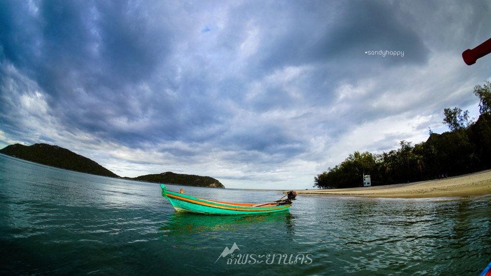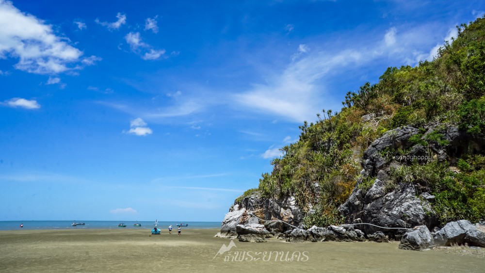 น้ำกำลังลง เห็นนักท่องเที่ยวหลายคน เดินไปขึ้นเรือเพื่อไปหาดแหลมศาลา