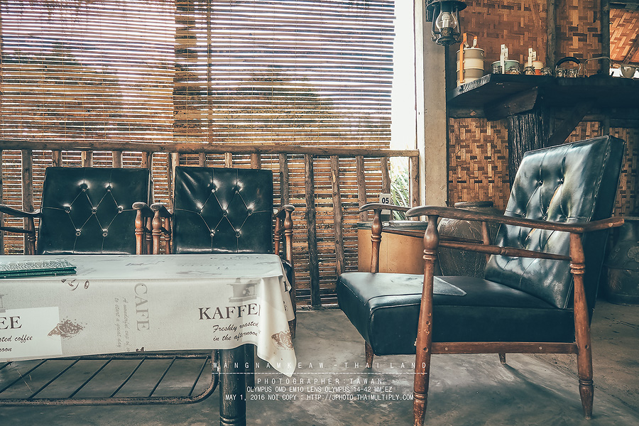 พอเดินผ่านประตูทางเข้าไปแล้ว มองไปด้านขวามือ จะเห็นมุมนั่งทานกาแฟ ซึ่งสร้างดูเรียบง่ายมากค่ะ