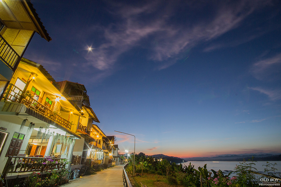 ช่วงเย็นหลังจากกลับจากการไปหาข้อมูล ดูสถานที่ และกลับมาทำธุระส่วนตัวต่างๆ เรียบร้อย ก็พากันออกจากที่พักไปเดินเล่นเลียบโขงกับถนนคนเดิน เสียดายมาไม่ทันพระอาทิตย์ตก แต่ช่วงเวลาโพล้เพล้หลังพระอาทิตย์ตกดิน ก็สวยงามไม่น้อย ภาพนี้ถ่ายจากหน้าที่พักผมเองครับ