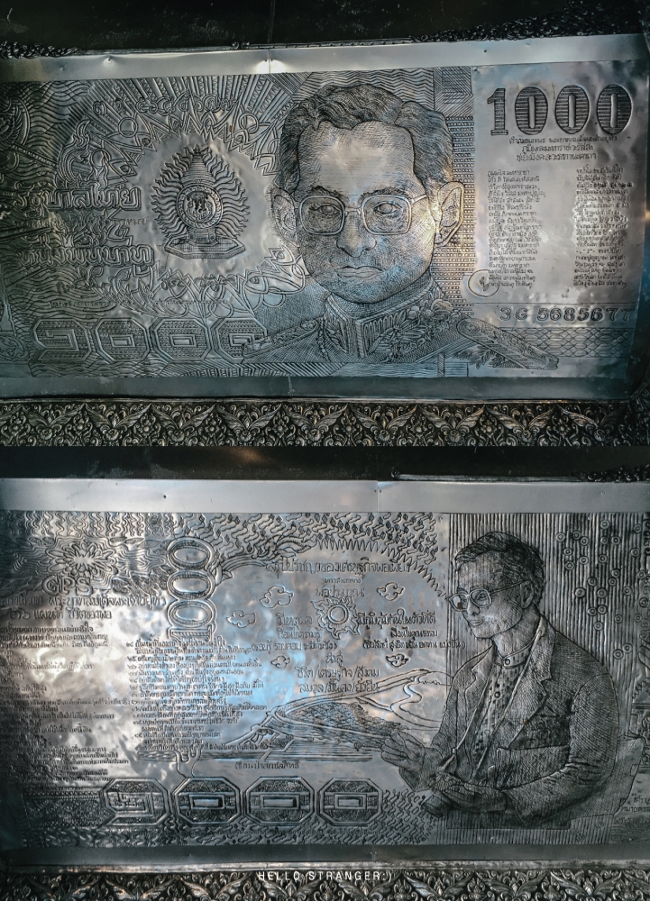 ก่อนเข้าด้านในอุโบสถ เราจะได้เห็นความสวยงามของงานศิลปะหัตถกรรม ที่ประดับตกแต่งที่ฝาผนัง ถ่ายทอดเรื่องราวทางพระพุทธศาสนาและ เพื่อถวายเทิดไท้ในหลวง ร.9