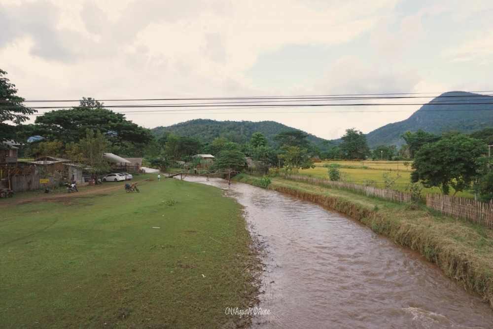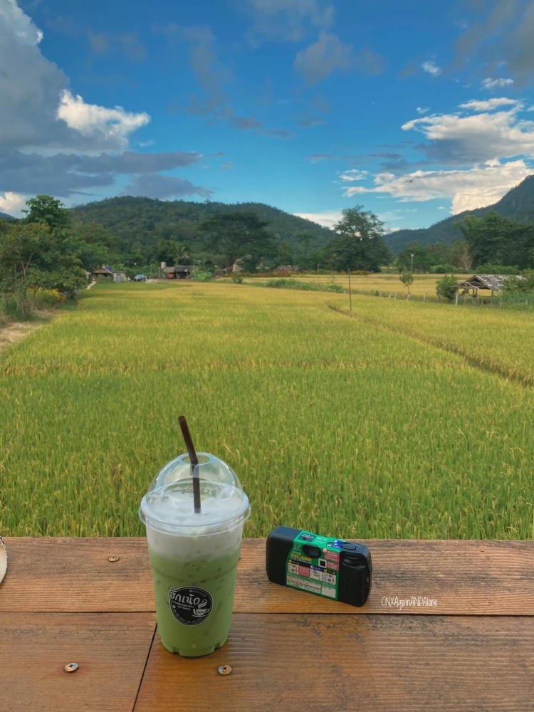 ด้านหน้าร้านเป็นวิวภูเขาและทุ่งนาที่กำลังตั้งท้องเปลี่ยนเป็นสีเหลืองส่วนด้านข้างติดกับลำน้ำคอง