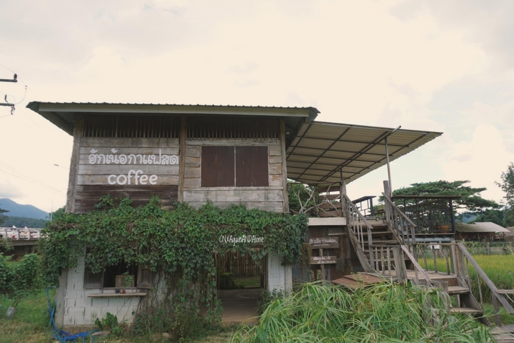 ตั้งกล้อง ตั้งเวลา วิ่งงงงงงงง..  ร่างกายต้องของน้ำหวาน.. เรามาแวะสั่งชาเขียวที่ร้านฮักเน้อออออ.. เป็นคาเฟ่ในเมืองคองที่น่ารัก บรรยากาศดี วิวโคตรงามมมมมม ทางเข้าร้านเป็นสะพานสานด้วยไม้ไผ่ ตัวร้านเป็นบ้านไม้ 2ชั้น