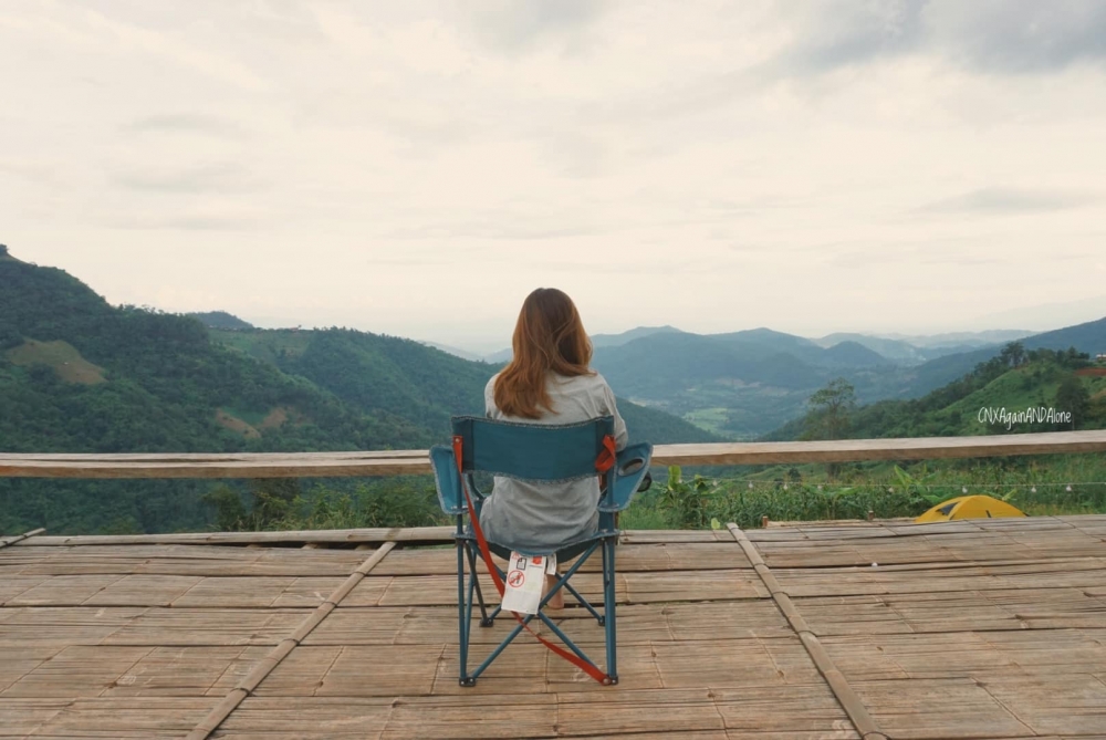 มานั่งชมวิวที่ลานที่พัก ซึ่งทำจากไม้ตีเป็นต่อกันเป็นลานกว้าง ด้านหน้าเป็นวิวภูเขาสลับซับซ้อน มองเห็นไกลๆนั้นก็คือ ตัวเมืองเชียงใหม่