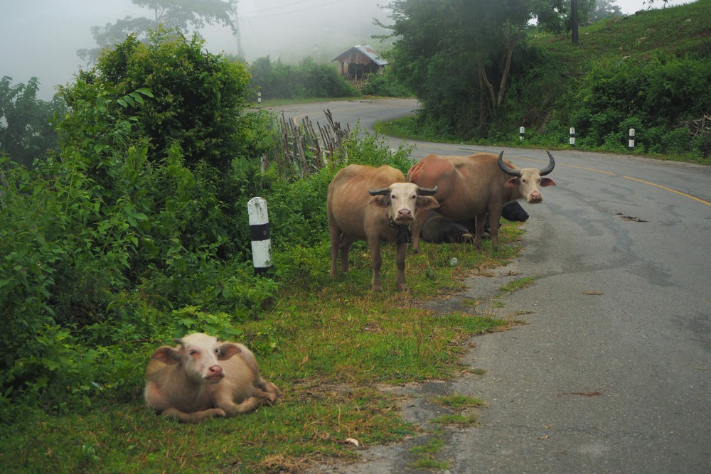 - จุดแรกของการเดินทางวันนี้ คือ ข้างทาง ไม่รู้เรียกว่าอะไร แต่สดชื่นมาก เป็นไหล่เขามองไปกว้างๆ มีวิวภูเขาเขียวๆ มีหมอกลอยเย็นๆ พร้อมฝูงควายเล็มหญ้า หรือบางตัวก็แอบอึแบบงงๆ