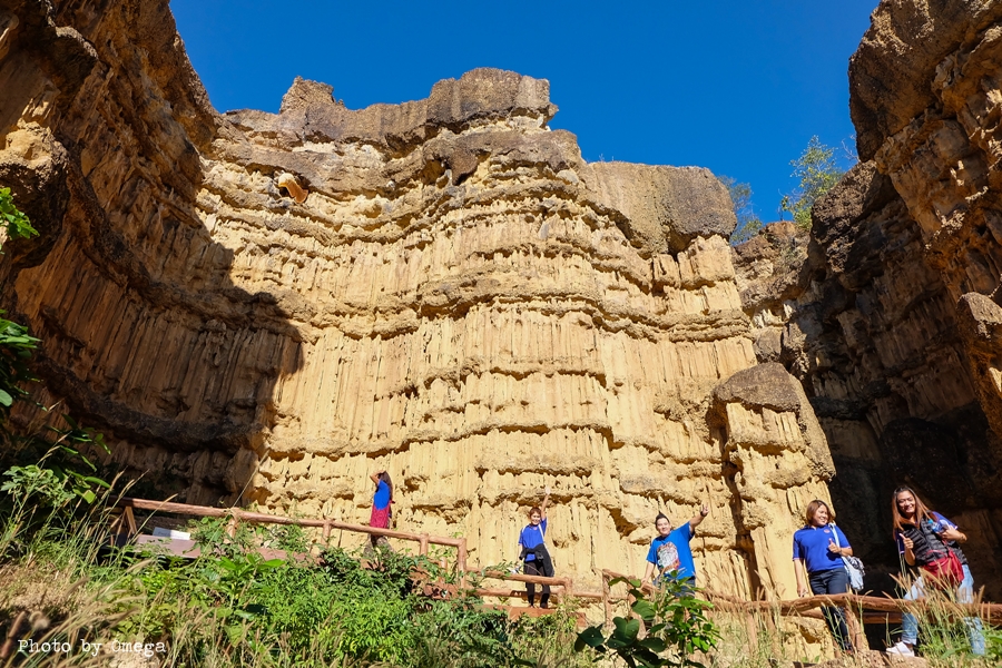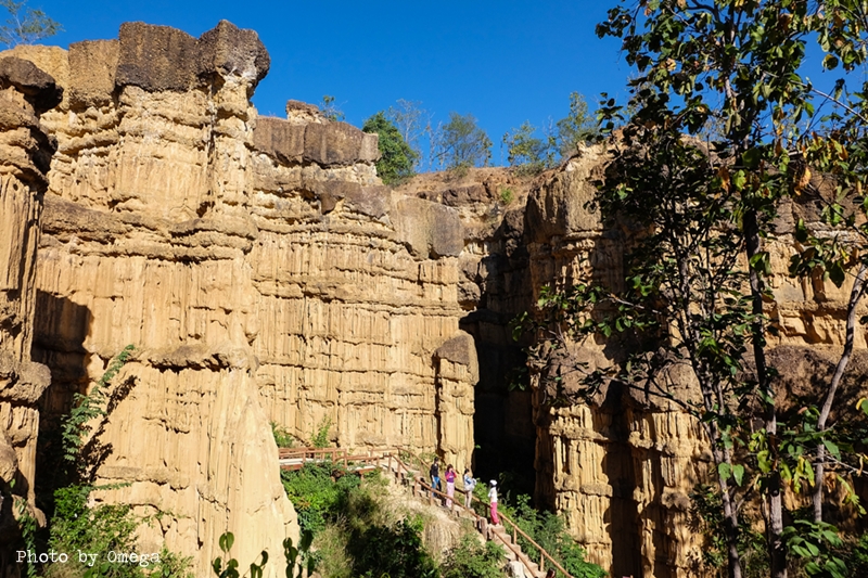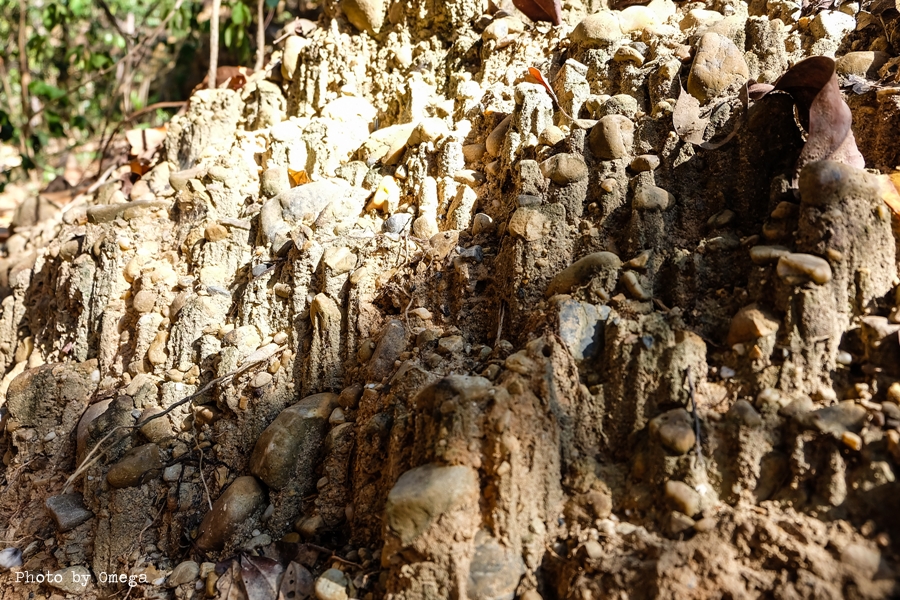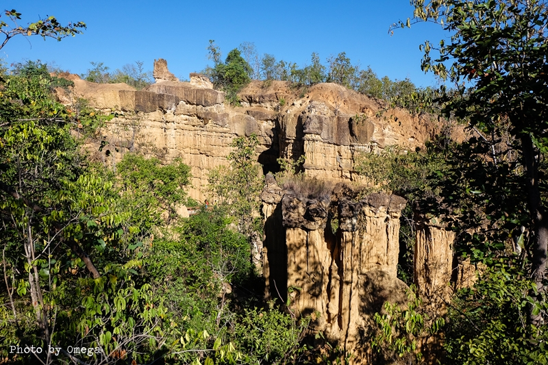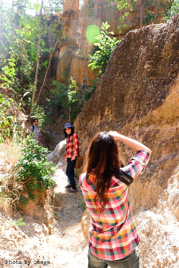 เค้าบอกว่า บริเวณนี้หลายร้อย หลายพันปีก่อน เป็นทางเดินของแม่น้ำค่ะ สังเกตได้จากลักษณะก้อนหิน ก้อนกรวด ที่มีลักษณะกลมๆ มนๆ เกลี้ยงๆ ที่กระจัดกระจายอยู่ในเนื้อดินเป็นจำนวนมาก  จนแม่น้ำได้เปลี่ยนสายย้ายทิศไหลผ่านไปที่อื่น บริเวณนี้ก็ได้ถูกยกตัวเป็นเกิดเป็นเนินเขาสูงตะกอนแม่น้ำก่อตัวทับถมกันเป็นชั้นๆ ผ่านกลายเวลาและถูกกัดเซาะจนมีลักษณะกลายเป็นหน้าผาและเสาดินที่มีรูปร่างแปลกๆแบบนี้ในทึ่สุดค่ะ