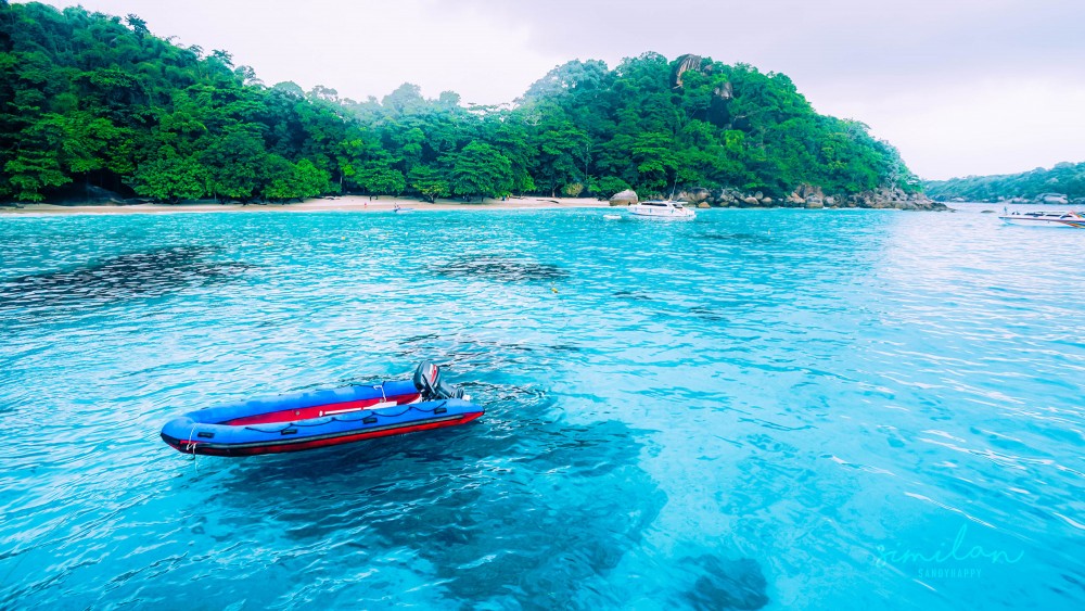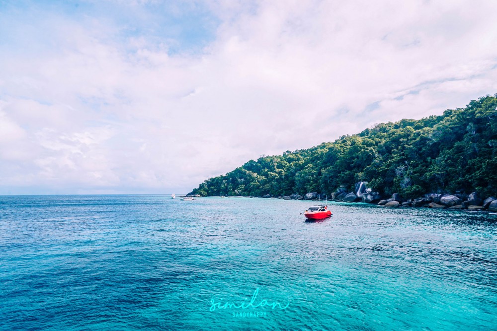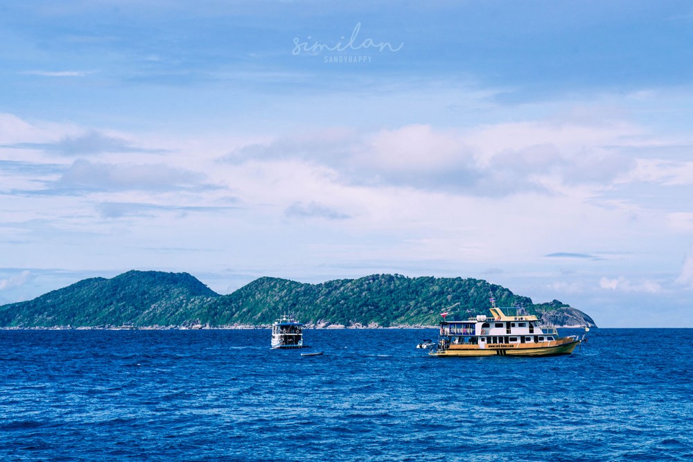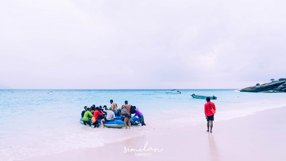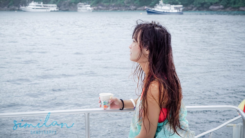 พอได้เวลาลงเรือเท่านั้นแหละ ฝนเทกระหน่ำมาหนักมาก รอจนกระทั่งฝนซาเม็ด แล้วก็ไปลงเรือกันค่ะ สมาชิกทัวร์สิมิลันเรามีหลายแบบ แยกกันตามสายรัดข้อมือ เพราะมีทั้งแบบ One Day Trip แบบค้างคืนวันเดียว และแบบค้าง2คืนแบบเรา หัวหน้าทัวร์สิมิลันของเรา ชื่อว่า เวย์ น้องน่ารักมาก มองน้องพูดภาษาอังกฤษให้ชาวต่างชาติแล้วก็มาพูดไทยให้กับคนไทย ฟังเพลินๆดีค่ะอ้อ! เราไม่เคยไปเที่ยวกับทัวร์ค่ะ นี่เป็นครั้งแรกเลย มันเลยดูแปลกสำหรับเรามั้งคะ ปกติเที่ยวเองแพลนเองทั้งหมด มีสิมิลันนี่แหละค่ะ ที่ดูยากสำหรับเราสักหน่อย เพราะต้องนั่งเรือออกไปไกลและต้องพักกับอุทยาน การจองผ่านทัวร์ก็ลดความยุ่งยากลงไปได้เยอะค่ะ เค้าจัดการให้ทั้งหมด ทั้งที่พัก การเดินทาง และอาหารการกิน การดำน้ำ ตลอด3วันของเรา