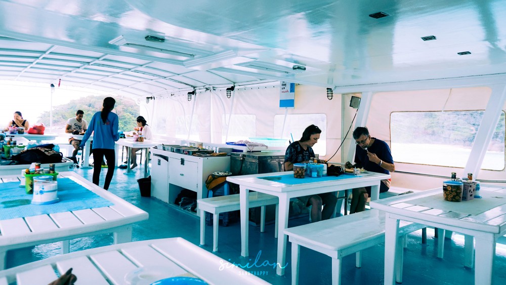 นั่งเรือแพยางติดเครื่องยนต์เพื่อไปขึ้นเรือใหญ่ เป็นเรือ 3ชั้นที่จะพาเราไปดำน้ำเกาะต่างๆของหมู่เกาะสิมิลัน เรือใหญ่ดีกว่าเรือเล็กตรงที่มันไม่โครงเครงมากเหมือนกับสปีดโบ้ท เรือนี้มีห้องน้ำ ห้องครัว มีWifi มีเสียงเพลงให้เราเพลินๆด้วยค่ะ