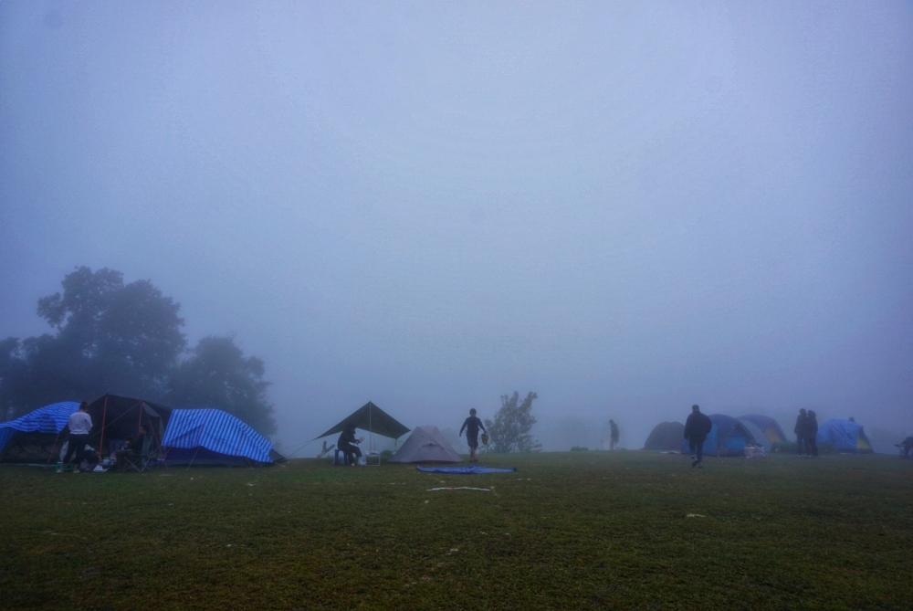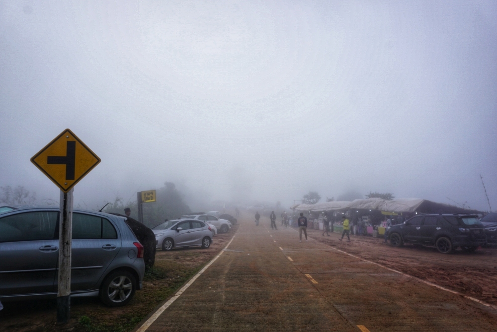 ตรงนี้เราจอดรถเพื่อลงไปเสียค่ากางเต็นท์ เวลาน่าจะประมาณ ห้าถึงหกโมงเย็น ไม่มีแสงแดดแม้แต่น้อย หมอกหนามากๆ คืนนี้เราจะกางเต็นท์ที่ลาน D เราพกเตาแก๊สปิคนิคมาด้วย ตอนกลางคืนเลยต้มน้ำกินโจ๊กกระป๋องกัน ยิ่งดึก ยิ่งลมแรง พัดหมอกมาด้วย หนาวสุดๆ