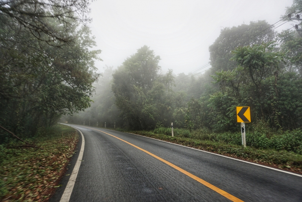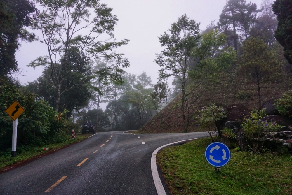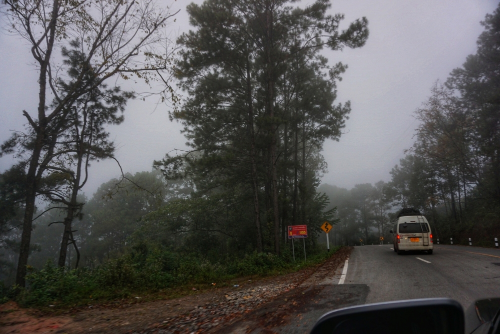 พอเลี้ยวขวาเข้าถนนหมายเลข 1095 ขับไปสักพัก ทางเริ่มโค้งชัน ขนาดเราไปหลายรอบแล้ว ยังหวั่นๆ เริ่มชันมากขึ้น หมอกเริ่มหนา ต้องเปิดไฟหน้ารถขับ